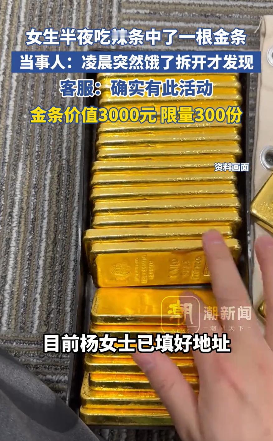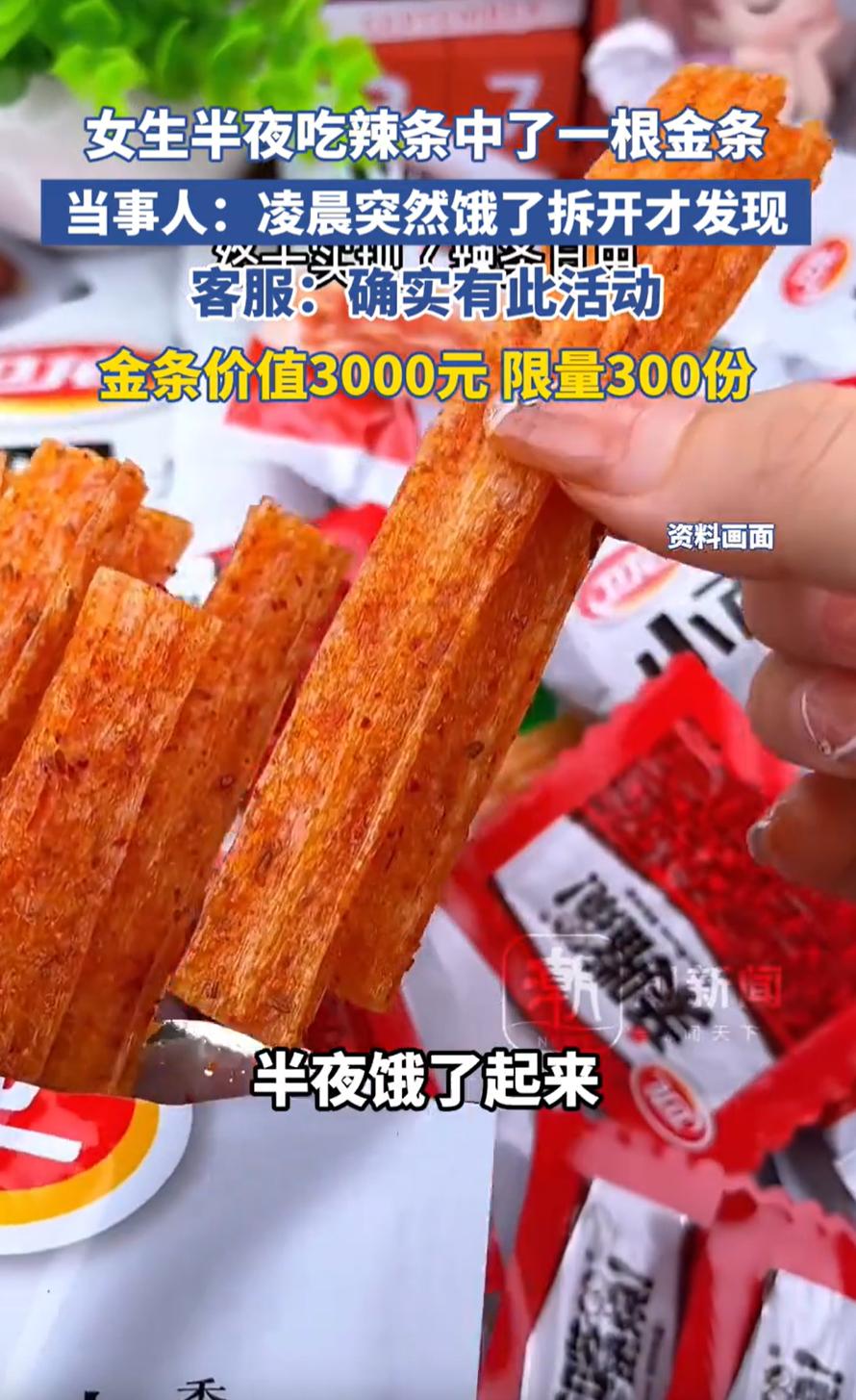 这就是命啊!四川绵阳,女子半夜肚子饿了,就在家里打开了一袋辣条吃了期间,期间发现有一个小卡片可以兑奖,女子随手一扫,发现竟然中了一根金条,开始她还不信,可问了客服,让她填写地址,她才发现这是真的 杨女士介绍,辣条是之前在楼下超市买的一个礼包,花了30多块钱,一直放在家里都没有吃,而且也没吃的想法,刚好那天晚上肚子饿了,找了一圈家里也没什么吃的,就把礼包打开了 随后就发现里面有个兑奖的卡片,兑了后显示奖品是“金条一份”,问了客服才知道,金条价值3000元左右,而且只限量300分,杨女士能够中奖,确实是个惊喜 有网友条调侃说:别人吃东西能挣钱,而我吃东西不仅花钱,还长肉 其实细想想,如今不少商品都喜欢在里面放张抽奖卡,搞点小活动。有人觉得这是营销,但也确实给平常的消费添了点未知的乐趣。只要不是骗局,这种小小的互动,就像给生活撒了点糖,不指望它多甜,但偶尔尝到,还是会笑一下 有时候,生活里很多惊喜,往往藏在最不起眼的地方。该吃吃,该睡睡,该认真就认真,该随意的时候也别太克制。有些好运,恰恰就是在你没打算要的时候,悄悄落到你手里的