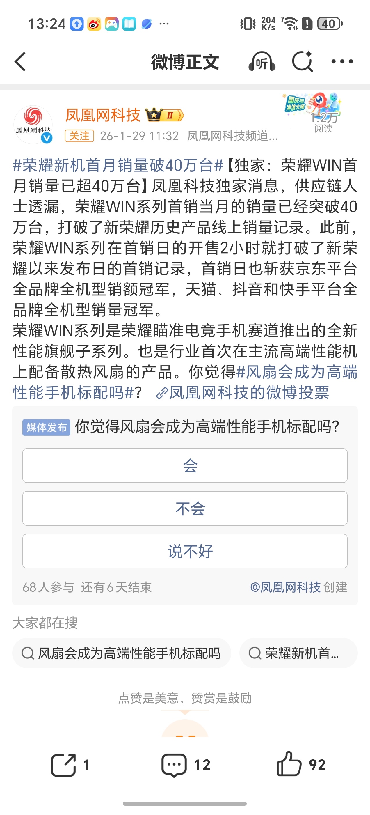 荣耀 WIN 系列首月销量超 40 万台了,印象中,好像耀子好久没有出过这么爆款的机器了,而且前两天我去线下店给手机贴膜问了一下,店员说现在去线上买 RT 都还要排队,妥妥的大爆款!荣耀的 WIN 系列相比于友商的电竞旗舰要晚出了一个多月,但是精准的产品定位让这个产品直接逆风翻盘,大电池加风扇,直接引领了电竞手机的下一个阶段。为什么荣耀能够做电竞手机?我觉得除了大电池之外,它的网络优化方面做得也是非常好的啊,毕竟在娘胎里头就是做这方面。那接下来大家也可以看到,越来越多的电竞手机都会上风扇,上大电池,但是荣耀好像在电池方面依然是遥遥领先的26 年听说也是一家独大!
