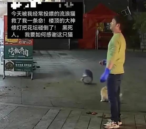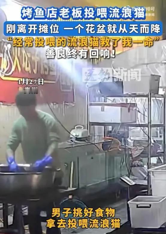 这真是现实版“好人有好报”! 贵阳一家烤鱼店的石老板,1月27号晚上在店门口杀鱼时,看到老熟人。一只常来蹭饭的流浪猫,就顺手拿起装鱼杂的不锈钢盆想去喂它。谁知刚走开不到两秒,“砰”的一声巨响,一个装满土和绿植,重达十多斤的花盆,从高空狠狠砸在他刚才站的位置,不锈钢盆当场被砸扁。 回头查监控,所有人都倒吸一口凉气。老板说,要是没去喂猫,这花盆正砸头上,后果不堪设想。更让人感慨的是,这花盆还不是谁乱扔的,是自家员工在二楼修灯时,电线不小心勾到花盆导致的意外。 奇妙的是,那只猫当时居然没被巨响吓跑。不少网友眼尖发现了这个细节,这么大的动静流浪猫早就吓得跑了,可是你看猫基本没动,它就是来救他的。这通灵性的表现,让整个事件添了几分暖意和宿命感。 石老板本就喜欢小动物,家里养了狗,这下更坚定了善念。他打算给这只“救命恩猫”置办个猫舍,正式收养它,还放话欢迎市民送流浪猫狗来,店里有的是鱼杂喂饱它们! 大家纷纷感慨善良会带来福报。说起来,高空坠物杀伤力极大,一块西瓜皮从25楼落下都能要人命。这次意外,既是善意的回响,也再次敲响了安全的警钟。看来,这世间所有的善意,真的都会在某个转角,悄悄守护你自己。