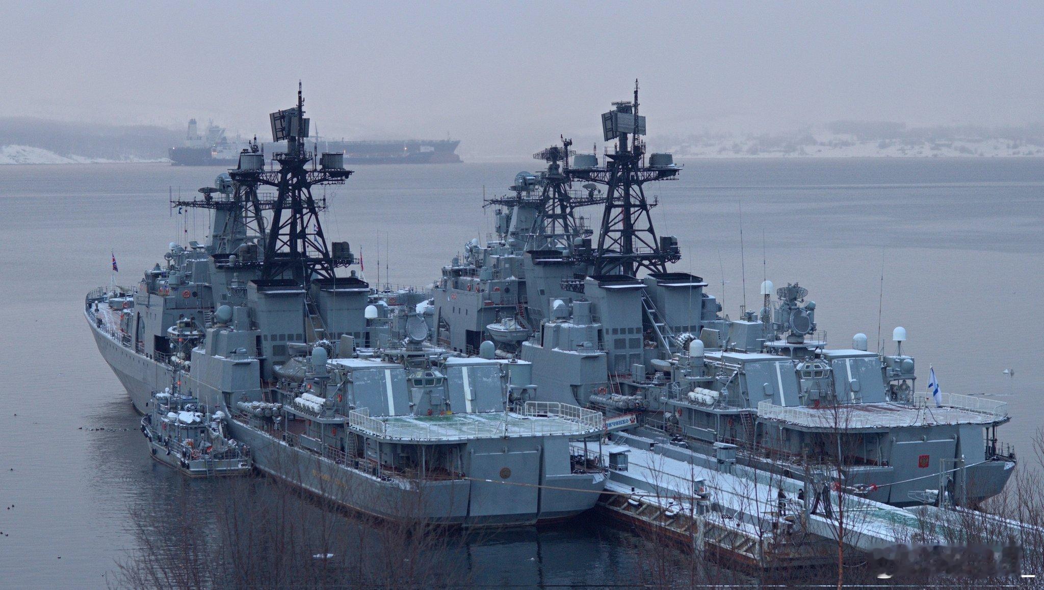 俄军055“乌斯季诺夫元帅”号光荣级巡洋舰近日在北莫尔斯克出航。605“列夫琴科海军上将”号和626“库拉科夫海军中将”号无畏级大型反潜舰停在泊位。俄罗斯海军