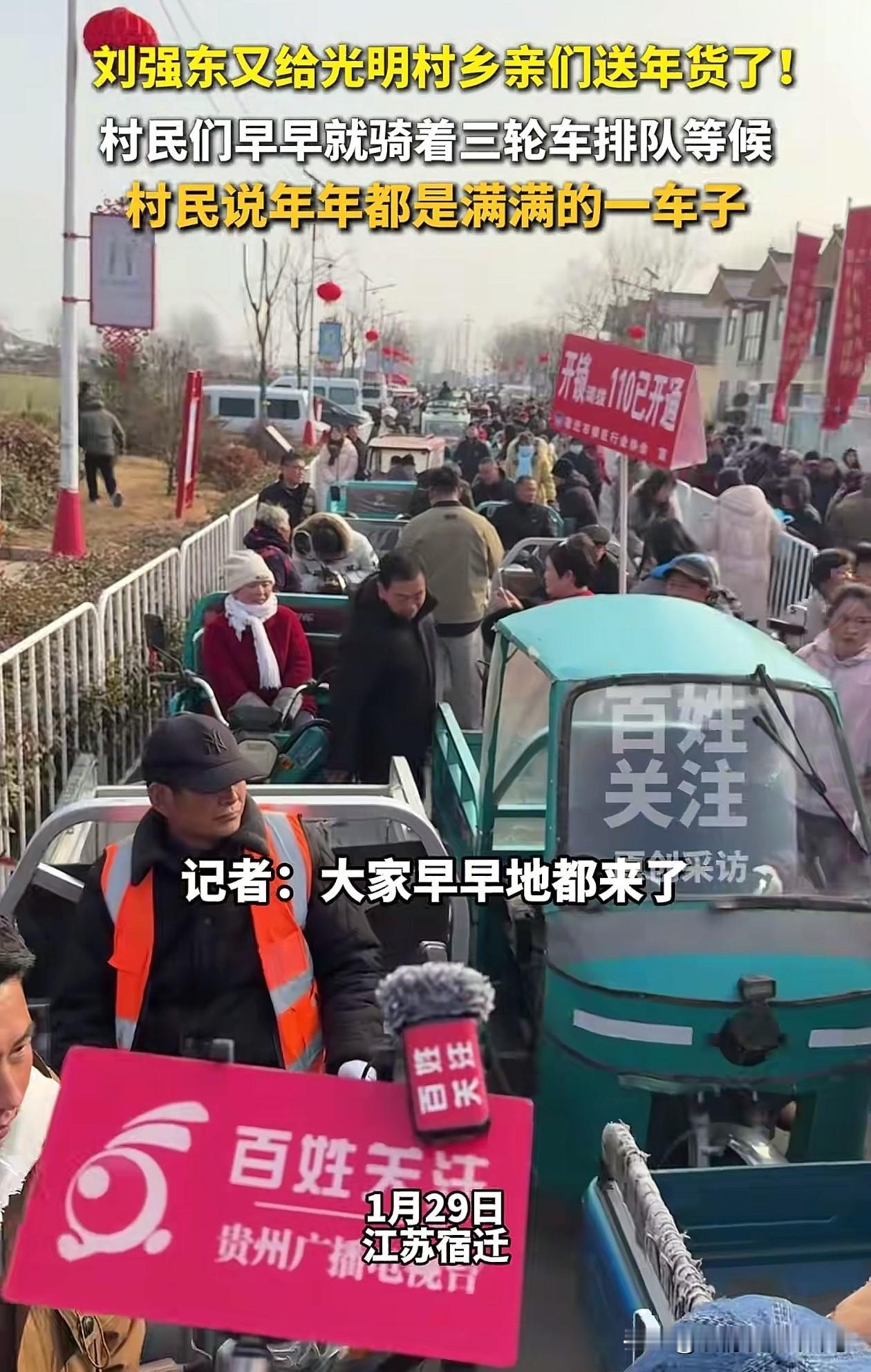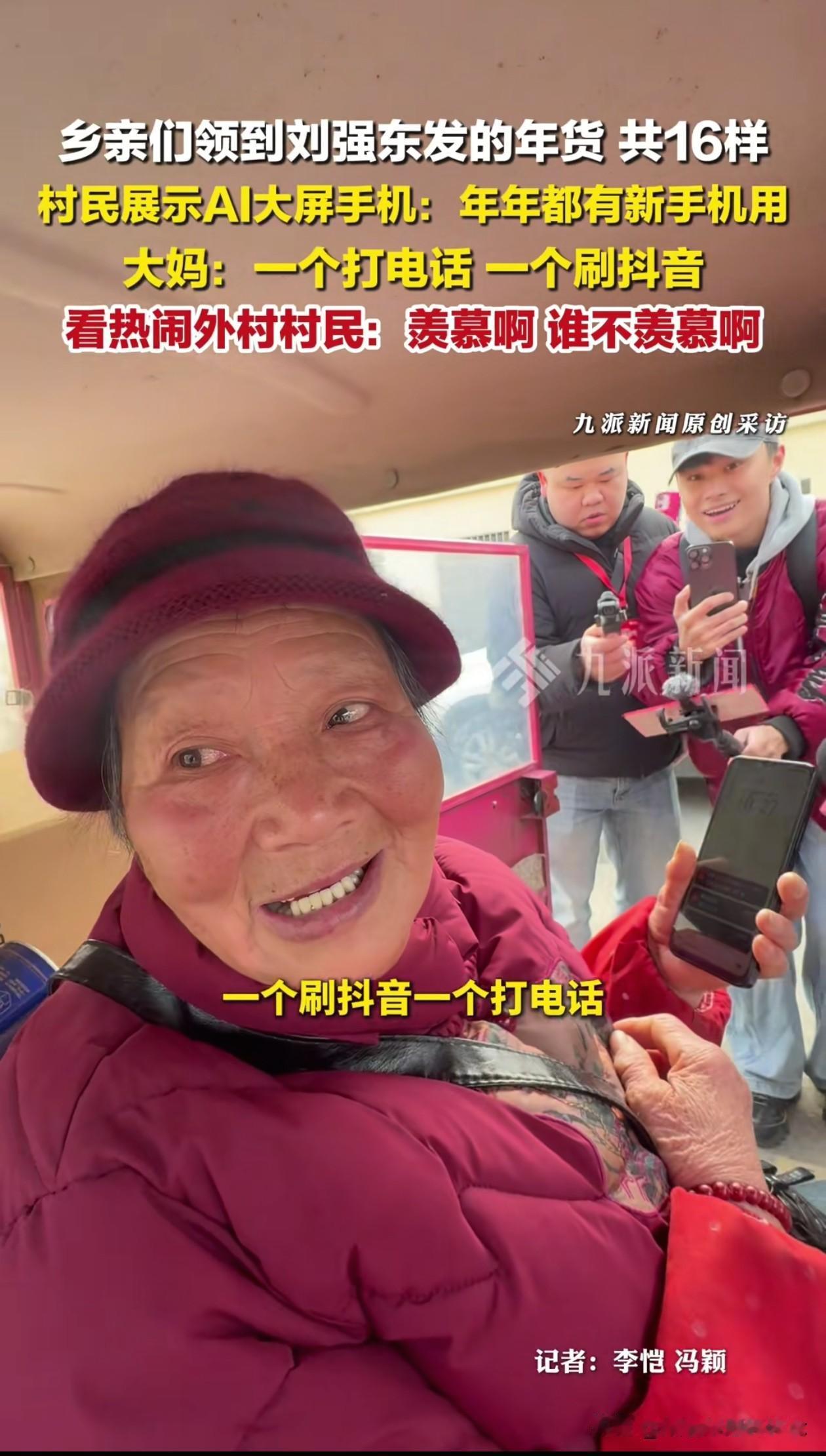 谁不羡慕啊! 光明村的村民领到刘强东发的年货了,一共16样! 一位大妈说,每年都有新手机,手机太多了,准备一部用来打电话,一部用来刷视频! 村民们今天一早就开着三轮车排队领年货,个个笑容满面。 挣钱的意义在此刻体现得淋漓尽致,吃水不忘挖井人,光宗耀祖,滴水之恩,当涌泉相报,就连光明村的年轻人在十里八村也算扬眉吐气了,不愁找对象了。 网友调侃,刘总再高考一次吧,76个鸡蛋和500块钱我一人承包了! 刘总这钱花得值,既挣了面子,更暖了人心,村民们脸上的笑容,嘴里的夸赞,成为了十里八乡的美谈,比投广告划算多了。 刘强东