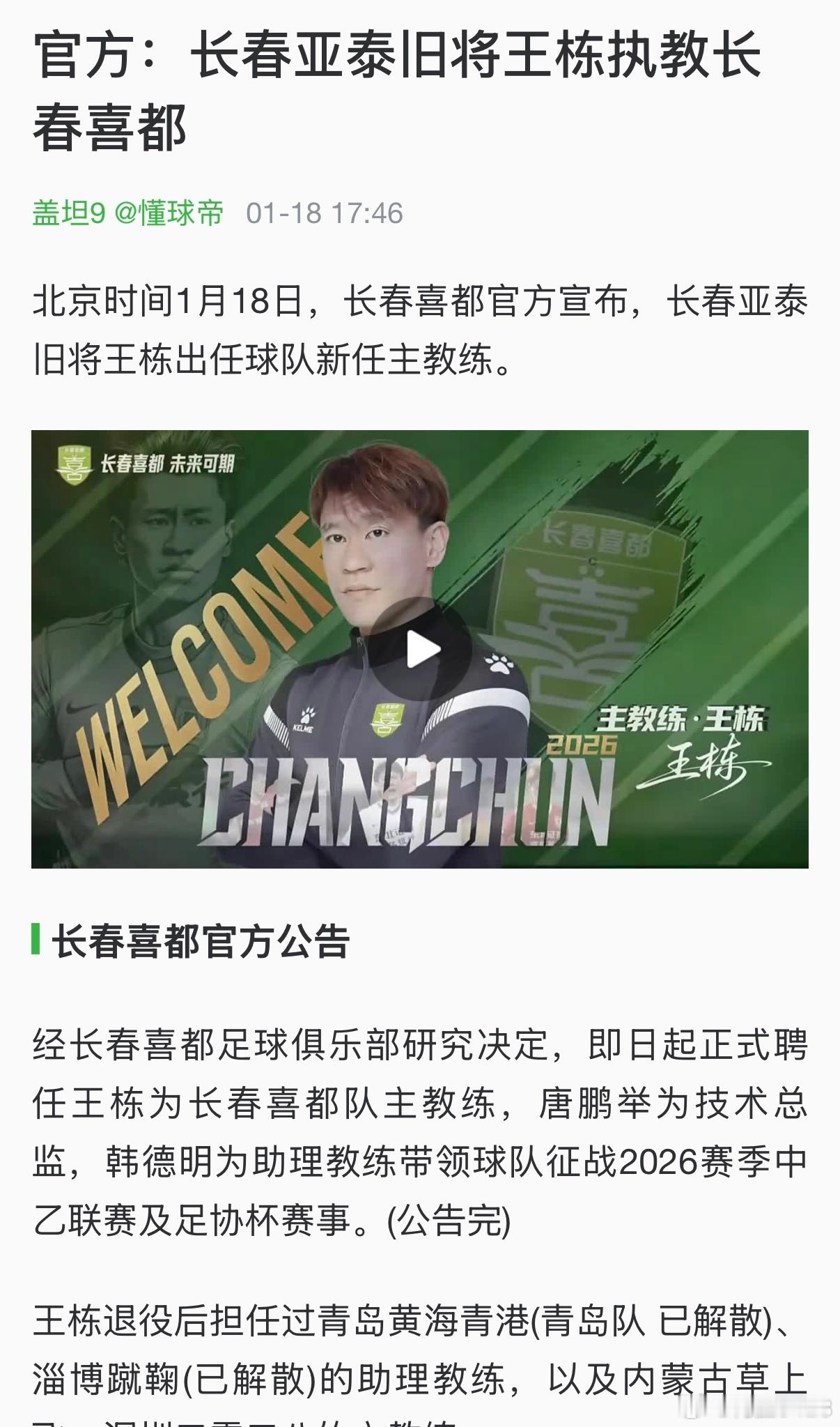 1月18日,长春喜都宣布亚泰名宿王栋成为主教练;1月29日,王栋被终身禁足。不知道是不是史上最短命的主教练李铁等73人终身禁止从事足球活动