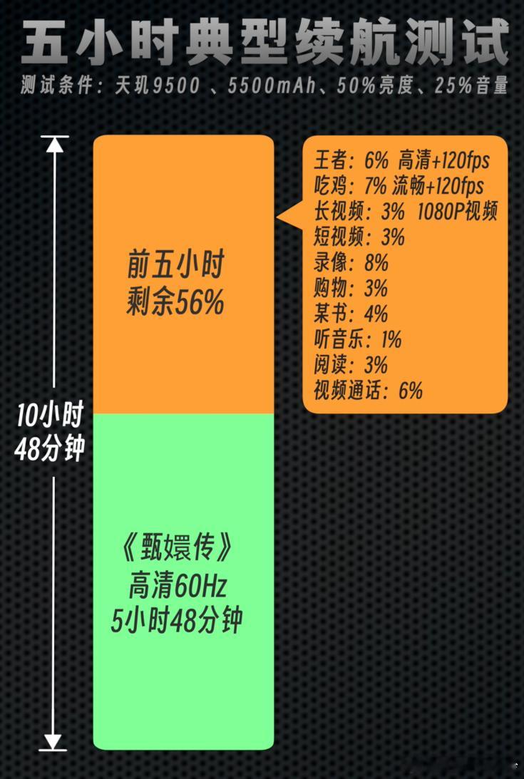 相比iPhone Air,荣耀Air在妥协了一点厚度的情况下,把续航大幅提升,不止是用了5500mAh大电池,还上了80W有线和50W无线。先来看看五小时续航测试(图1),10个项目耗电44%,继续看剧直到关机,共用时10小时48分钟,虽说成绩比不上7-8000的大电池,正常用一天也基本没问题。不过要注意的是,虽说上了天玑9500能效有保障,但在游戏上耗电要明显更多,如果是重度游戏续航可能会不够。80W有线快充,完全充满63分钟(图2),算是正常速度。半小时能从0充到58%,短时间应急补个电速度也不错。
