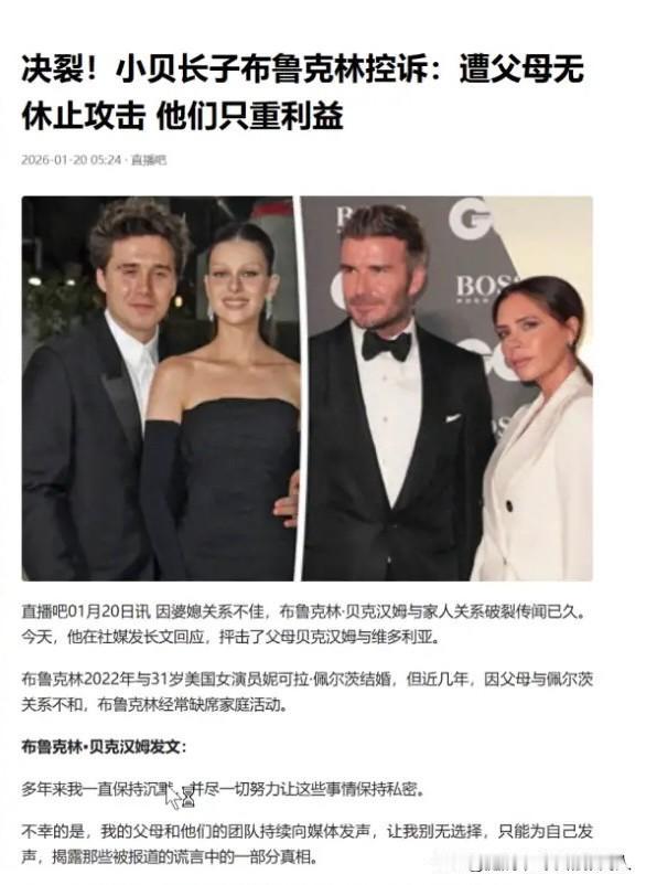 贝克汉姆家教最大的败笔: 你替孩子走完了所有的路,最后他只会觉得你挡道! 布鲁克林那6页“断亲书”一出来,我脑子里就俩字:活该!不是说孩子活该,是这对顶配资源的父母活该啊! 用顶级人脉、海量金钱铺路,摄影、做饭、踢球,哪样不是砸钱硬捧?结果呢?养出个干啥啥不行、甩锅第一名的“世界级巨婴”——觉得父母的付出都是理所当然,甚至把管束当成“攻击”,最后反过来捅父母一刀。 这剧情中国家长也太熟了吧!小时候怕他摔着碰着,长大了怕他累着苦着,恨不得替他走完所有路。掏空六个钱包给买房,退休金拿来补贴家用,大事小事都替孩子扛着,以为是爱,结果养出个不懂感恩的“白眼狼”。 你剥夺了他成长该吃的苦,他就会剥夺你晚年该有的体面;你把路都铺平了,最后他只会觉得你挡了他的道!这就是典型的溺爱反噬啊! 教育最可怕的从来不是没钱,而是把孩子养成“伸手党”,觉得父母的付出天经地义。惯子如杀子,贝克汉姆这一课,学费真的太贵了!