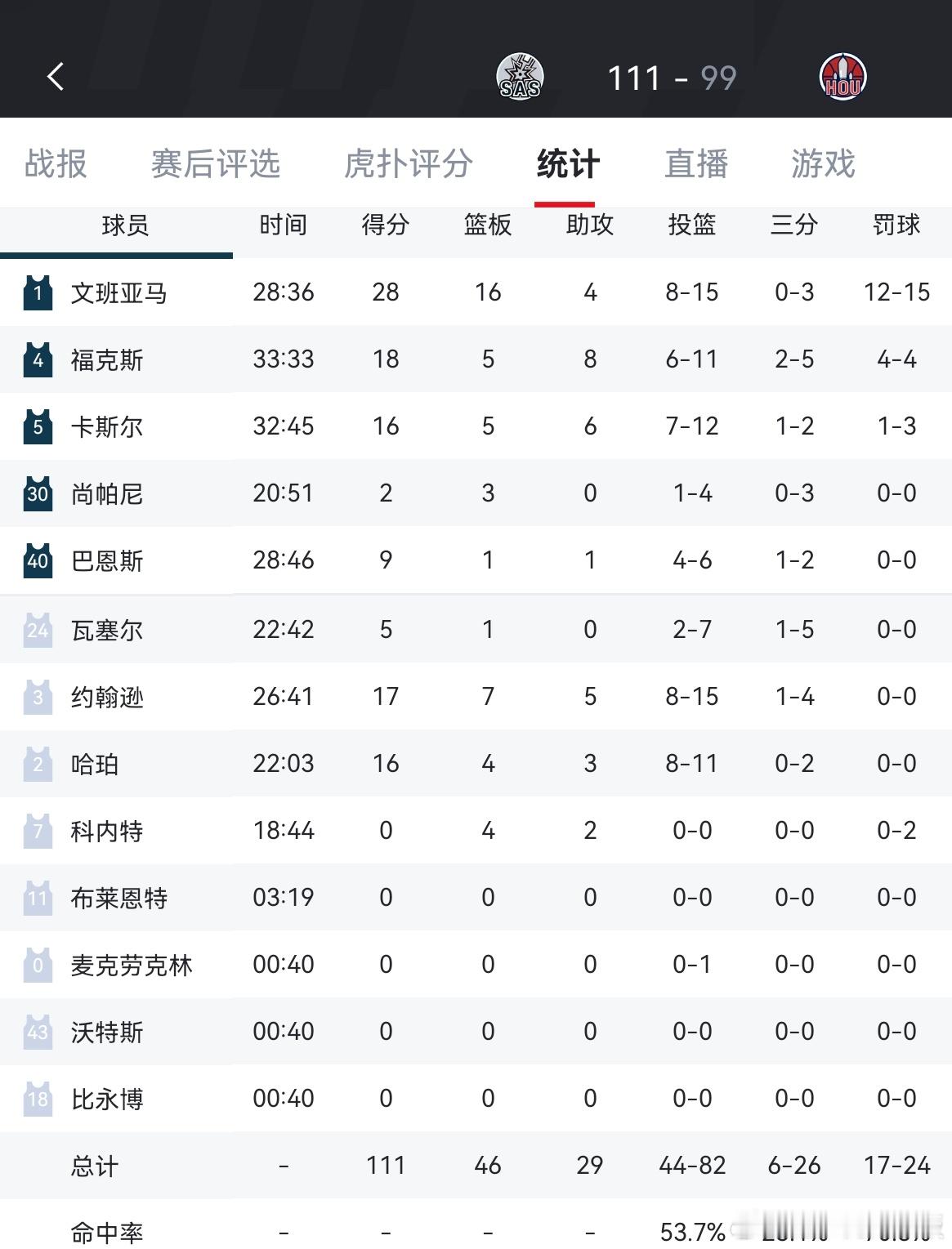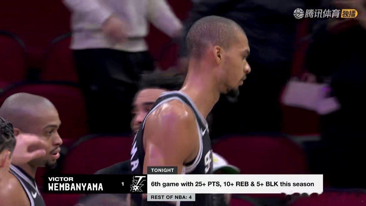 火箭99-111不敌马刺,和湖人的胜场差仍为0.5场文班亚马28分16板4助攻5