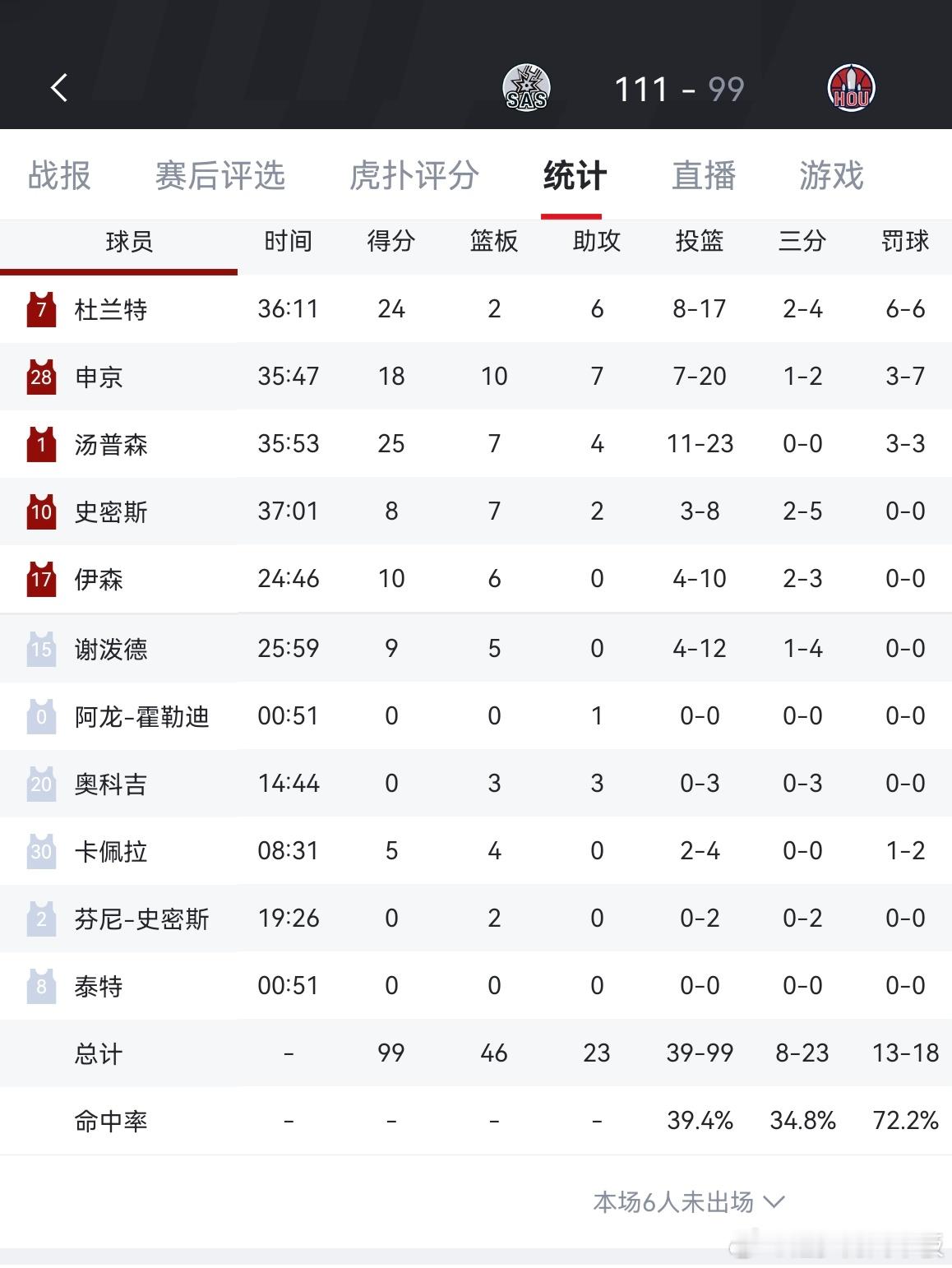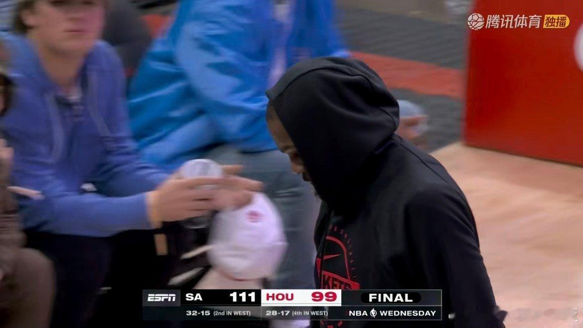 火箭99-111不敌马刺,和湖人的胜场差仍为0.5场文班亚马28分16板4助攻5封盖,杜兰特24分马刺vs火箭