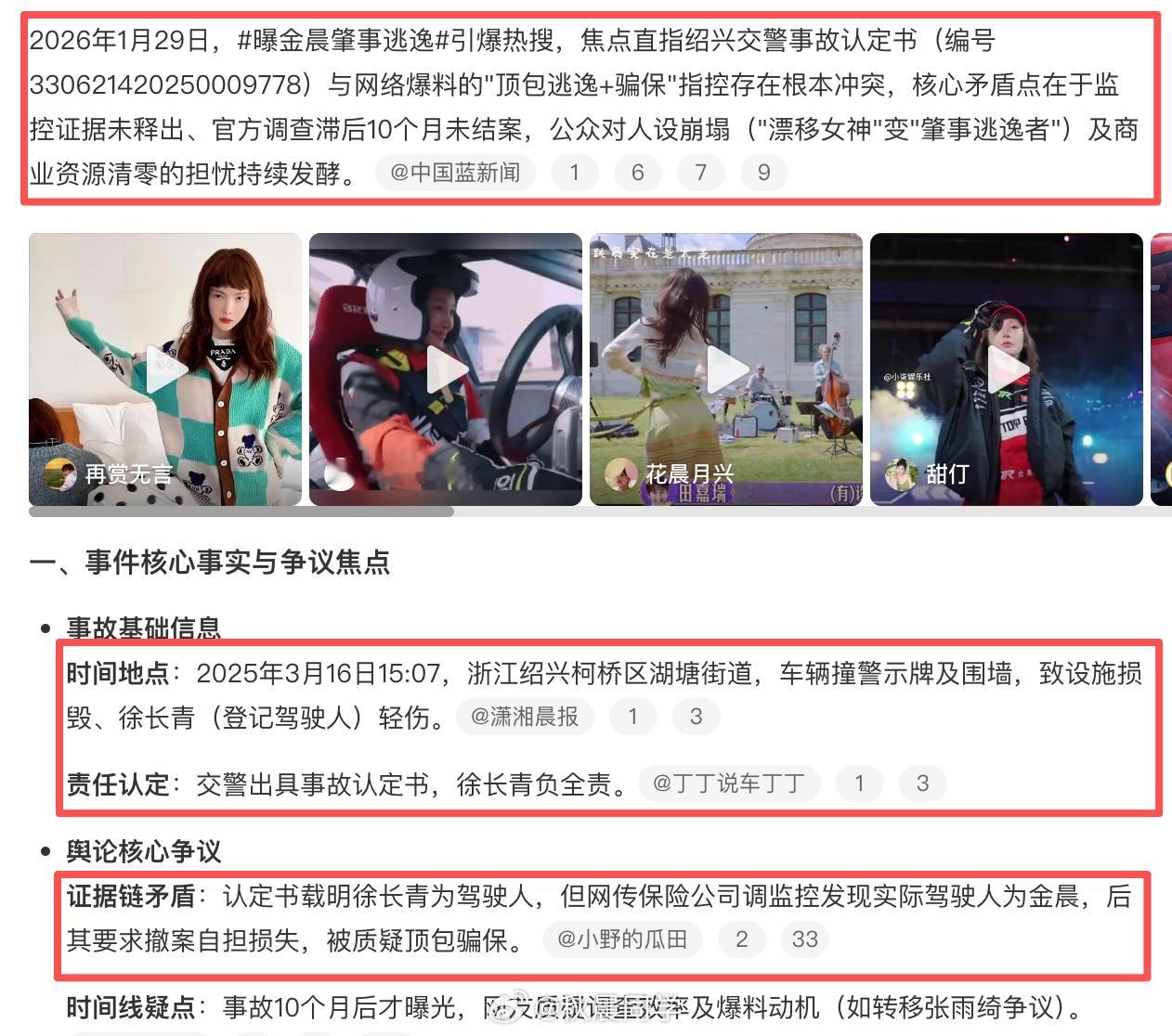 交警回应金晨被曝肇事逃逸金晨疑似涉嫌交通肇事逃逸“交警出具事故认定书,徐长青负全责。认定书载明徐长青为驾驶人,但网传保险公司调监控发现实际驾驶人为金晨,后其要求撤案自担损失,被质疑顶包骗保。成年人要为自己做的事负责