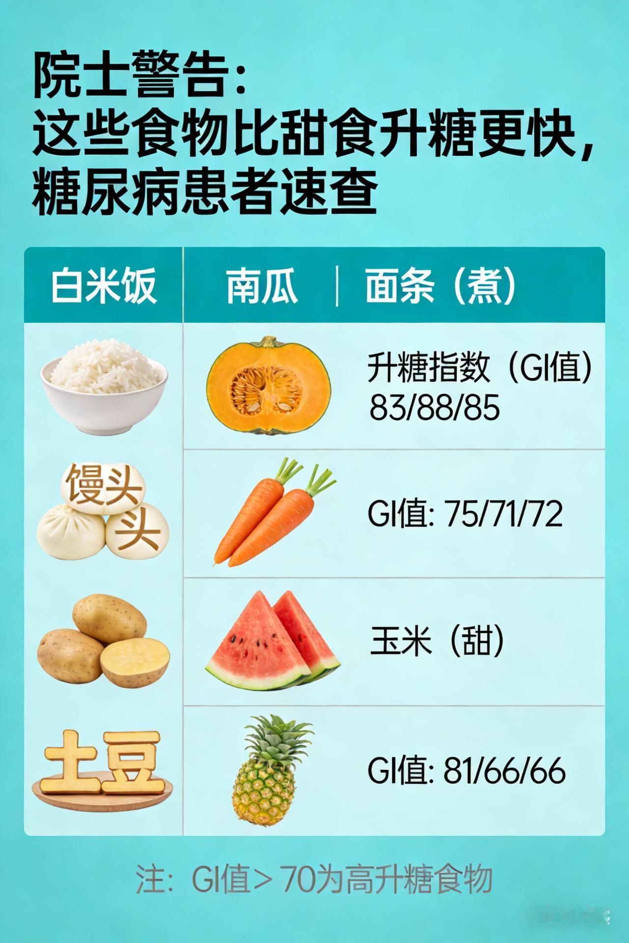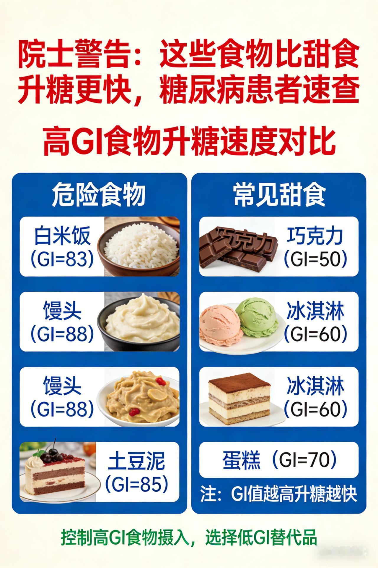院士警告:这些食物比甜食升糖更快,糖尿病患者速查 多名权威院士联合警示:精制主食成糖尿病患者“隐形杀手”,饮食结构调整刻不容缓 近日,一场聚焦糖尿病患者饮食健康、关乎数亿患者生命质量的学术研讨会在京举行。多位在糖尿病防治领域具有卓越建树和深厚学术造诣的院士联合发声,向全社会发出紧急警示:精制淀粉类主食,这一长期占据糖尿病患者餐桌的“常客”,正悄然成为威胁患者健康的“隐形杀手”,其升糖速度远超部分甜食,糖尿病患者亟需重新审视饮食结构,开启科学控糖新征程。 升糖“元凶”现形:白米饭背后的血糖危机 在医学研究的精密坐标系中,升糖指数(GI值)是衡量食物引发人体血糖升高程度的核心标尺。权威数据显示,白米饭的GI值高达83,而作为血糖升高基准的葡萄糖,其GI值为100。这一数据对比清晰地揭示了一个残酷现实:当糖尿病患者摄入白米饭后,它如同被精准引爆的“糖分炸弹”,在胃肠道内迅速被分解为葡萄糖,并以惊人的速度涌入血液,导致血糖在短时间内急剧飙升。 长期临床观察和科学研究证实,频繁食用白米饭等精制主食,会使胰岛β细胞长期处于超负荷运转状态。胰岛β细胞作为人体血糖调节的“关键卫士”,其功能在持续高压下会逐渐衰退,进而引发胰岛素分泌不足或胰岛素抵抗等严重问题。这不仅会加剧糖尿病患者的病情,还会显著增加心血管疾病、视网膜病变、肾脏病变等并发症的发生风险,严重威胁患者的生命健康和生活质量。 同类“帮凶”肆虐:精制主食的集体“攻势” 除了白米饭,白馒头、白面条等精制主食同样在糖尿病患者的饮食中扮演着“帮凶”角色。在现代化的食品加工过程中,这些主食原本富含膳食纤维、维生素和矿物质的麸皮和胚芽被大量去除,只剩下易于消化的淀粉核心。这种结构上的巨大改变,使得它们在胃肠道内的消化吸收速度大幅提升,升糖速度也随之加快。 许多糖尿病患者由于缺乏对精制主食危害的充分认识,往往只将注意力集中在甜食的控制上,而忽视了这些看似“无害”的主食。长期下来,血糖波动频繁,难以达到理想的控制目标,身体各项机能也在不知不觉中受到损害。专家指出,精制主食的过度摄入已成为糖尿病患者血糖管理的一大难题,亟待引起高度重视。 院士支招:科学换“粮”,构建健康饮食新格局 面对精制主食带来的严峻挑战,院士们凭借深厚的学术底蕴和丰富的临床经验,为糖尿病患者量身定制了一套科学、实用的饮食调整方案。 优选低GI粗粮,打造血糖“稳定器” 院士们强烈建议糖尿病患者将精制主食替换为低GI的粗粮、杂粮,如糙米、燕麦、荞麦、红薯等。这些食物富含膳食纤维、维生素和矿物质,膳食纤维能在胃肠道内形成一层黏性溶液,像一道天然屏障一样延缓碳水化合物的消化吸收,从而平稳血糖上升速度。同时,它们还能增加饱腹感,减少其他高热量食物的摄入,有助于患者控制体重和血糖。研究表明,长期坚持食用低GI粗粮的糖尿病患者,其血糖波动幅度明显减小,并发症的发生风险也显著降低。 巧排饮食顺序,掌控血糖“节奏器” 除了选择合适的食物,饮食顺序的合理安排也对血糖控制至关重要。院士们建议糖尿病患者遵循“先蔬菜,后蛋白质,再主食”的进食顺序。先食用富含膳食纤维的蔬菜,可以为胃肠道铺上一层“缓冲垫”,减缓后续食物的消化吸收速度;再摄入优质蛋白质类食物,如瘦肉、鱼类、豆类等,为身体提供必要的营养支持,同时增强饱腹感;最后进食主食,这样可以有效避免血糖在短时间内急剧上升。临床实践证明,这种科学的进食顺序能够帮助糖尿病患者更好地控制餐后血糖,提高生活质量。 严控进食分量,筑牢血糖“防护墙” 控制每餐主食的摄入量是血糖管理的关键环节。院士们提醒糖尿病患者要根据自身的身体状况、活动量和血糖水平,合理确定每餐主食的摄入量,并遵循少食多餐的原则,避免暴饮暴食。一般来说,每餐主食的摄入量应控制在50 - 100克左右,具体可根据个人情况进行调整。同时,要注意食物的搭配和营养均衡,确保身体获得足够的各种营养物质。 在这场与糖尿病的持久战中,饮食管理是至关重要的一环。多名权威院士的联合警示,为广大糖尿病患者敲响了警钟。只有及时调整饮食结构,远离精制主食的“甜蜜陷阱”,选择科学、健康的饮食方式,才能更好地控制血糖,预防并发症的发生,守护自己的健康未来。让我们携手共进,以科学的饮食为武器,向糖尿病发起有力反击,迎接更加美好的生活。
