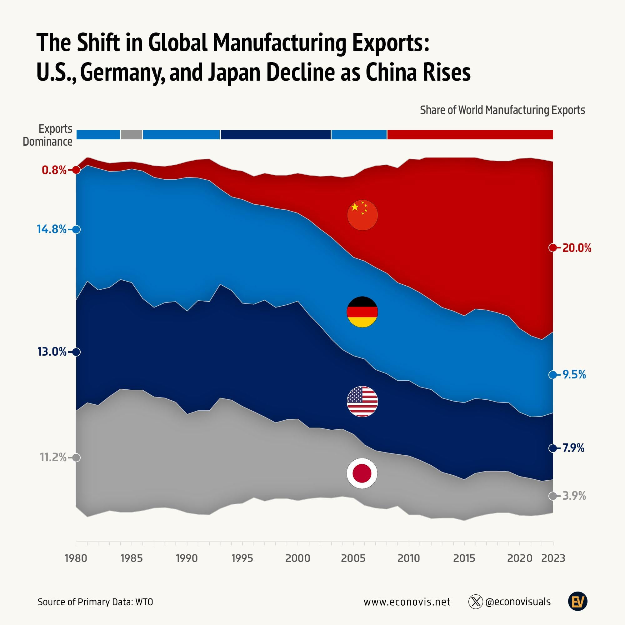 从 1980 年到 2023 年大概 40 年时间里全球制造业出口的份额。中国从接近 0 到 全球的 20% 多。而德美日三国,抵抗最坚挺的,其实是德国。最疲软的,是日本。。。
