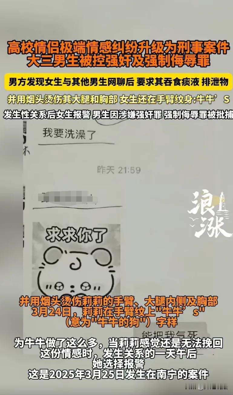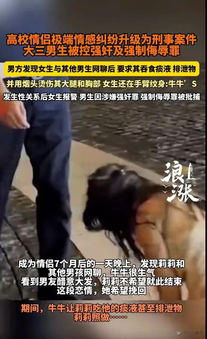 女子为了挽回男友,把自尊降到最低,得知无法挽回后,直接报了警,称对方侵害了她!广西南宁,18岁的莉莉,也正是想接触异性,展示自己魅力的时候,她是当地一所高校的大一新生。这时她就发现网上有一个帅气的小伙,对方是22岁的牛牛,也是这所高校的大三学长,不管是身材还是脸蛋,都特别吸引她的关注,因此就加了对方开心的聊了起来。 对方要比她大个四岁,也是正喜欢展现自己的魅力,吸引异性的眼光的时候。 这两人起初感觉都非常好,都有一种相见恨晚的感觉。 这样网上有了初步了解,就发展成线下交流,两人依然感觉很好,很快就在2025年年初确立了恋爱关系。 不过女孩是一个喜欢追逐新鲜事物的人,她除了和男友牛牛聊天,她也喜欢和其他的异性聊聊天。 但是这一幕在2025年3月16日,被牛牛在他校外租住的出租屋里发现后,特别不满意,认定女子是一个心花的人,因此对她的态度就别扭起来。 但是女子只是和别人简单的聊天,并没有牵扯到任何的感情。 但她认为自己这样的举动可能确实伤害到自己男友,既然自己有过错,自己又那么爱对方,因此,愿意放下自尊,去迎合男友。 可是男友不再相信女子,对方越是靠近自己,自己就越是抵触。 但是女子确实不愿意放手啊,这让男友一再的想折磨他,想来发泄自己心中的不满。 中途,也就是3月16日当天及之后的几天里,牛牛还逼迫女子吃过自己的口痰、排泄物这些,女子觉得只要能够挽回男友的心,她做什么都值得。 但是男友在后来对女子的态度,根本不是喜欢你,而是厌恶到极点。 他用这样的方式,无非就是发泄心中的不满,他不在意女子是否离害,他只在意在此时此刻自己能够把自己心中的怨气给发泄掉。 一看女子还是不愿意离开,他便在2025年3月23日凌晨,直接要求了一个更过分的要求,带女子去纹身店,让女子纹了一个纹身,纹的是一只小狗,还配着“牛牛’S”的字样,意思是她是他的狗。 女子已经卑微到这种程度,但男友还是对她非常生硬和冷淡。 女子在3月25日下午,终于幡然醒悟,觉得自己已经付出了所有,把自己的自尊都踩在了脚下,还是获得不了对方的谅解,那就算了。 不过,当她对男友进行放手的那一刻,自尊心又突然的提升,感觉之前男友对自己所做的一切都是冒犯,于是在当天下午4点左右,走出出租屋便直接报了警。 因为当天下午1点左右,他们也发生了关系,所以在走出来报了警后,女子所提供的证据确实能够证明他们之间存在关系。 但是,男友牛牛则表示,做这一切都是两人自愿的,不存在强迫谁。 而女子则表示,在以前相亲相爱的时候,确实是自愿的,但是后来就不一样了,后来就是对方在发泄,强迫自己做的那些侮辱性的事,包括最后一次发生了关系,也是在被胁迫的状态下进行的。 随后,男子牛牛在2025年4月就因为此事被检察院批准逮捕拘留,家属得知此事后,赶紧找到女子莉莉,愿意支付7万元赔偿金进行和解,就怕影响儿子的学业以及今后的发展。 莉莉接到男友的父母向自己道歉,心中的结也舒缓了一大半,想想曾经两人的相爱和过往,也愿意出具《刑事谅解书》,不再追究对方的刑事责任。 但是强奸罪的认定,不会因为女子想停止追究就停止的,检察院将会提供证据进行公诉。 案件后续经历了两次退回补充侦查和两次延长审查起诉期限,在2025年12月,检察院正式以强奸罪、强制侮辱罪对牛牛提起公诉。 目前,案件已经移交至法院,尚未开庭审理,牛牛是否构成犯罪、最终会面临怎样的处罚,还需要等待法院的最终判决。 《刑法》第二百三十六条:以暴力、胁迫或者其他手段强奸妇女的,处三年以上十年以下有期徒刑。《刑法》第二百三十七条:以暴力、胁迫或者其他方法强制侮辱妇女的,处五年以下有期徒刑或者拘役。 本事件中,牛牛的精神胁迫与暴力行为,已让莉莉陷入不敢反抗的状态,其行为符合两罪构成要件,虽获谅解可从宽,但仍需数罪并罚。 对于此事,大家如何看?素材来源于浪涨新闻