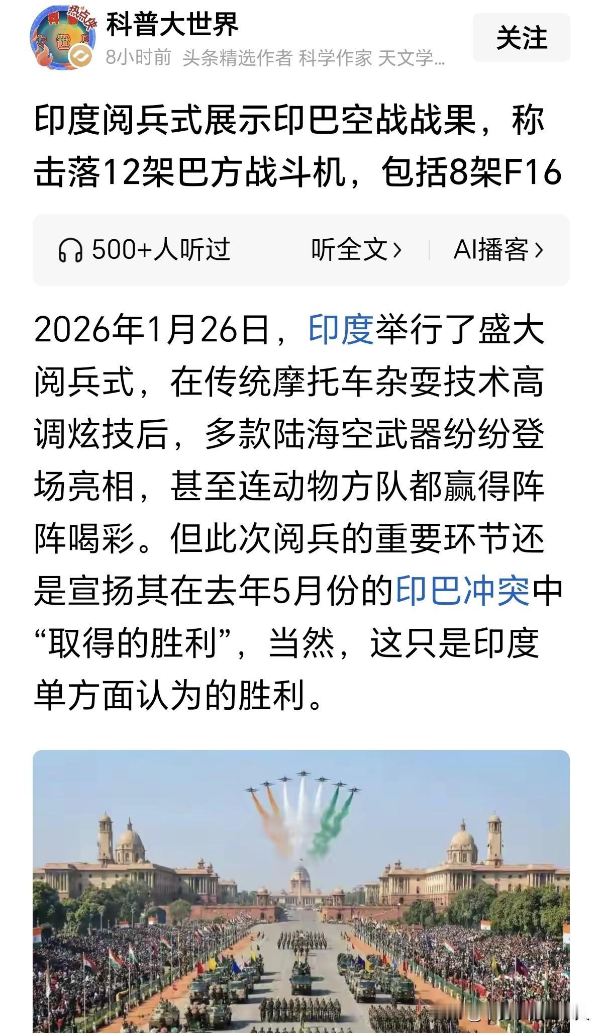 印度阅兵式现“魔幻闹剧”:妄称击落12架巴战机,自欺欺人到极致! 2026年1月26日,在印度第77个共和国日的盛大阅兵式上,一场荒唐的“胜利宣扬”将“印式自欺”推向了新的高度。当着受邀出席的欧盟领导人的面,印度高调宣称在2025年5月的印巴“辛杜尔行动”空战中,一口气击落12架巴基斯坦战斗机,其中包括8架美制F - 16、4架JF - 17“枭龙”,还额外击毁了巴方预警机,号称让对手“损失超33亿美元”,上演了一出自我陶醉的“大捷”闹剧。 更荒唐的是,从空战结束到阅兵式,印度的“击落数”如同吹气球一般不断膨胀:起初称击落1架F - 16,后来增加到5架,最后干脆凑出12架的“整数大捷”。然而,从头到尾,印度军方连一张清晰的战机残骸照片、一段可靠的雷达记录、一个能证实的目击者证词都拿不出来。 不仅巴基斯坦直接否认了所有损失,还公布了截获的印度空军通话录音、被击落的印军“阵风”战机残骸照片,甚至详细列出了坠毁地点和战机编号。更打脸的是美国的表态,美方直接戳穿谎言:“不知道巴基斯坦境内有任何美制F - 16被击中”。 要知道,F - 16的销售和使用都受美国严格管控,印度随口就说“击落8架”,简直是顺带戏弄了美国一番。 印度之所以在阅兵式上卖力上演这场“虚假胜利秀”,是因为如今国内经济疲软、民生问题凸显,莫迪政府只能靠编造“压倒性胜利”来转移矛盾,煽动民族情绪,同时向欧盟贵客“展示实力”,维护其“军事强国”的虚假形象。 这种“战果造假”早就是印度的“惯用伎俩”:之前声称击落600多架巴方无人机,可巴方实际出动才300多架;这次更过分,直接在阅兵花车上搞“纸扎沙盘”,还原“摧毁歼 - 10CE”的虚构场景,将自欺欺人发挥到了极致。 但是,有些事情,骗得了自己却骗不了世界,这种连自己都骗的行为,除了沦为全网笑柄,终究无法改变实战失利的现实。