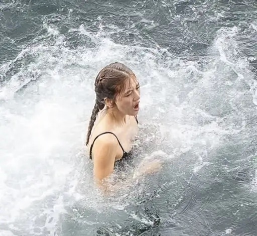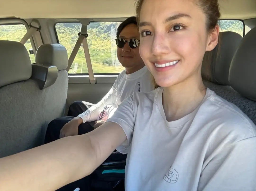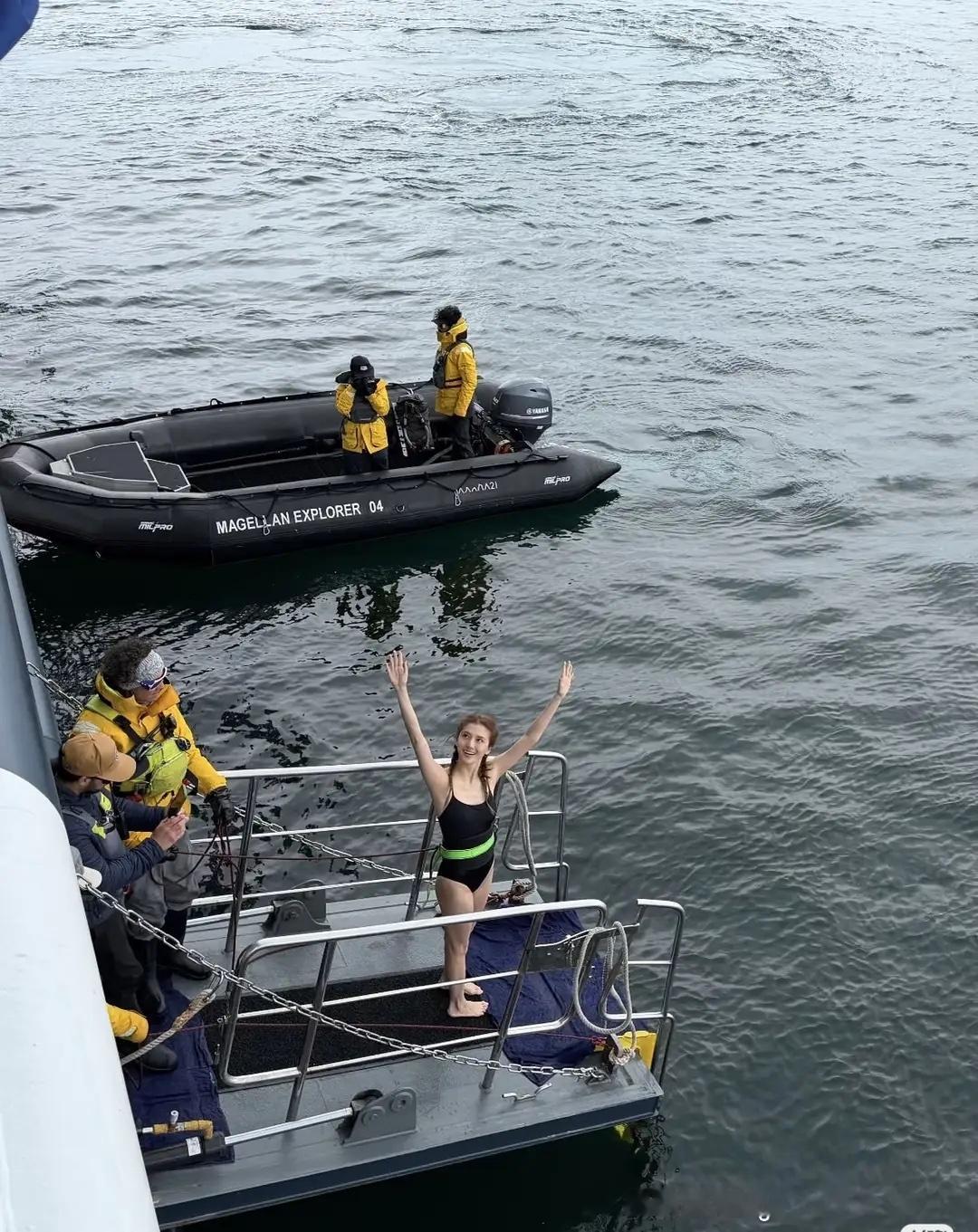 吴千语带老公智利旅游,不怕冷穿泳装跳海,素颜脸上长斑但还是美