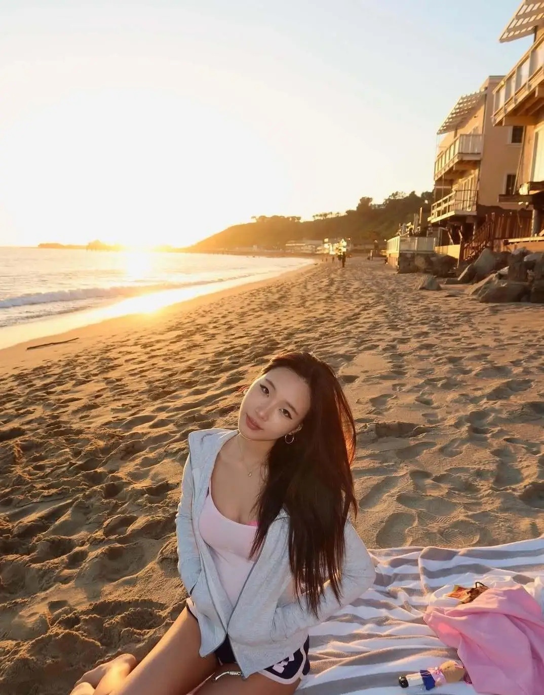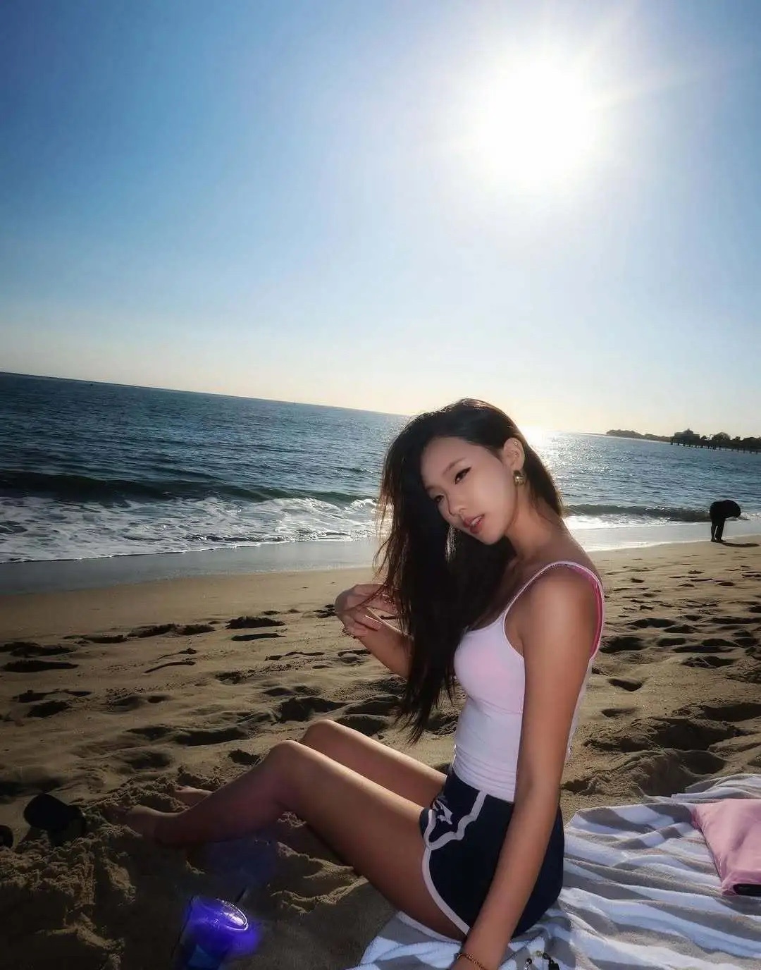 小S20岁大女儿在美国海边看日落,她穿着吊带衫和短裤在沙滩上享受着日光浴,全身皮肤呈现小麦色,身材凹凸有致,看起来好阳光性感,实在太美了!