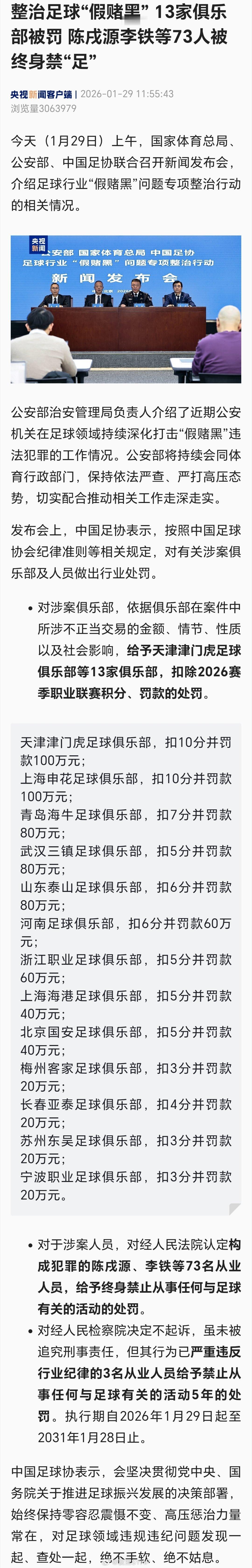 李铁等73人终身禁止从事足球活动13家足球俱乐部涉假赌黑被罚整治足球“假赌黑” 13家俱乐部被罚 陈戌源李铁等73人被终身禁“足”。