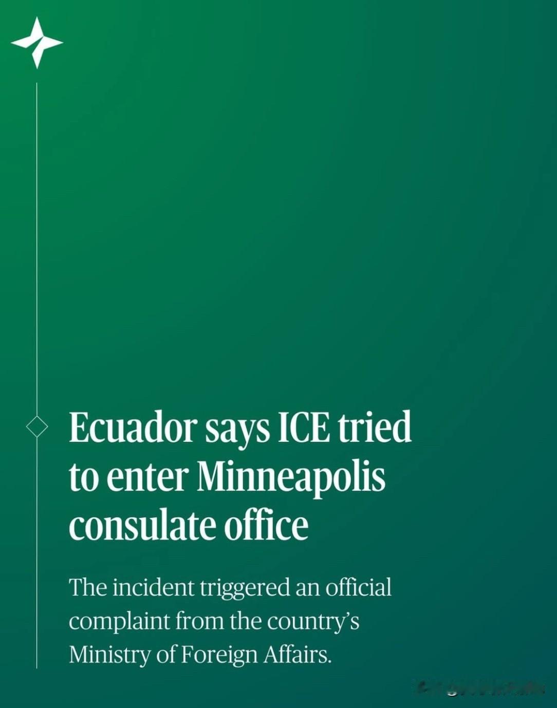美国海关与移民执法局越来越无法无天了,以为特朗普的背书是尚方宝剑,连外交领事馆都敢冲击。 厄瓜多外交部27日发布声明表示,明尼苏达州明尼亚波利斯市一名移民与海关执法局(ICE)特工27日上午11时左右,试图在未经许可的情况下,强行进入厄瓜多驻明尼亚波利斯领事馆,随即遭到馆方人员阻止。 领事馆职员迅速采取行动并关上大门,告知该名探员“这是厄瓜多领事馆,你不能进来”。这名随后就领事馆人员进行言语威胁,悻悻离去。 美国移民及海关执法局(ICE)特工竟然以为自己可以违反国际法。美国国会必须立即采取行动,制止他们的这种行为。领事馆是厄瓜多尔的领土,ICE 特工很幸运,厄瓜多尔的安保人员沒有做出像他们一样的反应。
