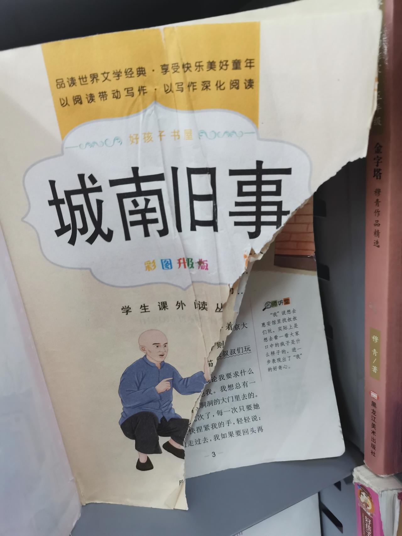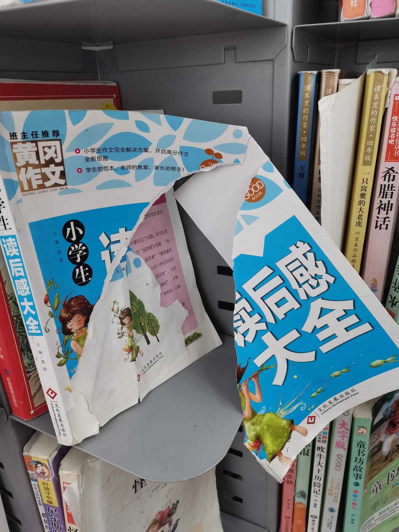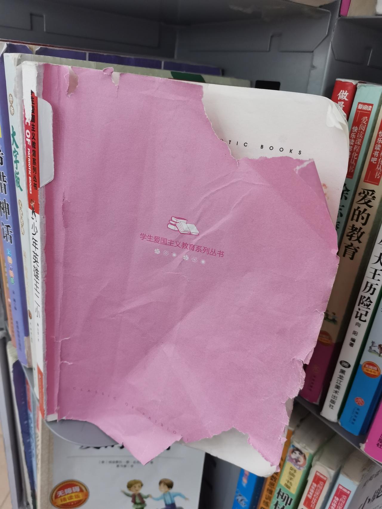 中午,我们娘仨吃完烤肉,一起逛沃尔玛,来到二楼图书角,我想找本书看看,对于一个爱读书的人来说,看到书架上的书被人撕烂,真的是怒火中烧。 大概率是熊孩子撕烂的,这么不爱惜书籍,估计家里人也不爱读书,没有爱惜书籍的良好习惯,家里也没有读书氛围。 每个熊孩子的背后都有一个熊家长,对孩子监管不到位。 书籍是人类的朋友,我呼吁有孩子的家长,嘱咐自家孩子不能撕烂书籍,要做一个爱书读书的好孩子。