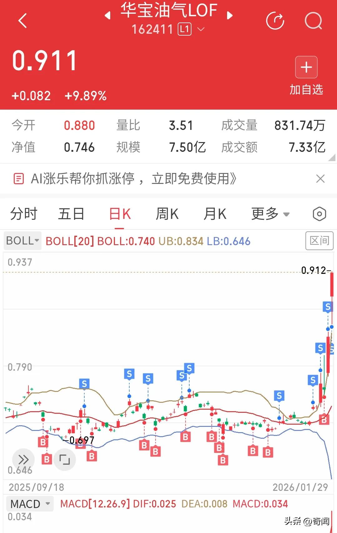 市场上资金太多无处可去,油气LOF被爆炒,市值只有7.5亿的一个基金,1月29日,成交额7.4亿,几乎全部换手交易了。而外围石油天然气并没有暴涨,真是资金太多无处可去,到处找炒的地方。 华宝油气LOF涨停