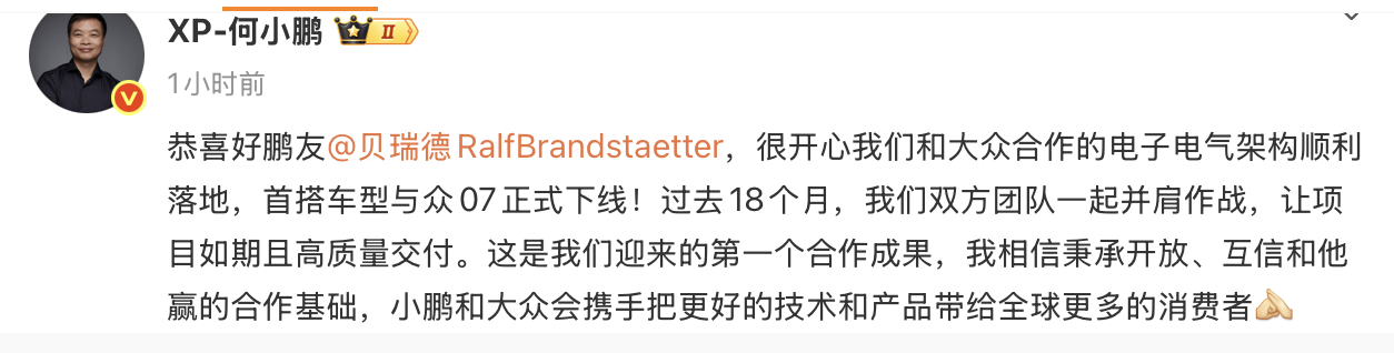小鹏和大众合作的电子电气架构首款车型——与众07下线!连大众都在和新势力的小鹏合作,所以你还要叫它“新势力”吗?