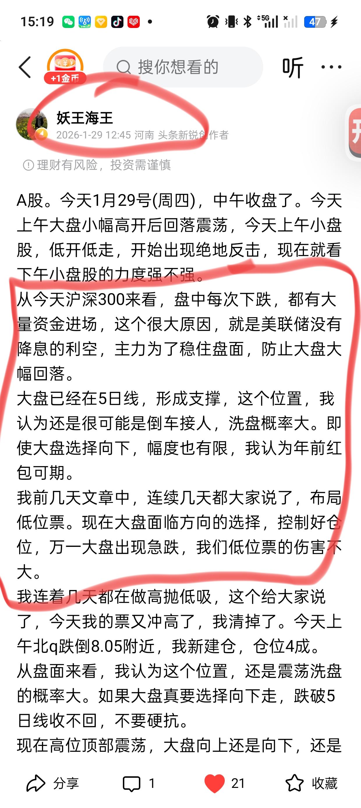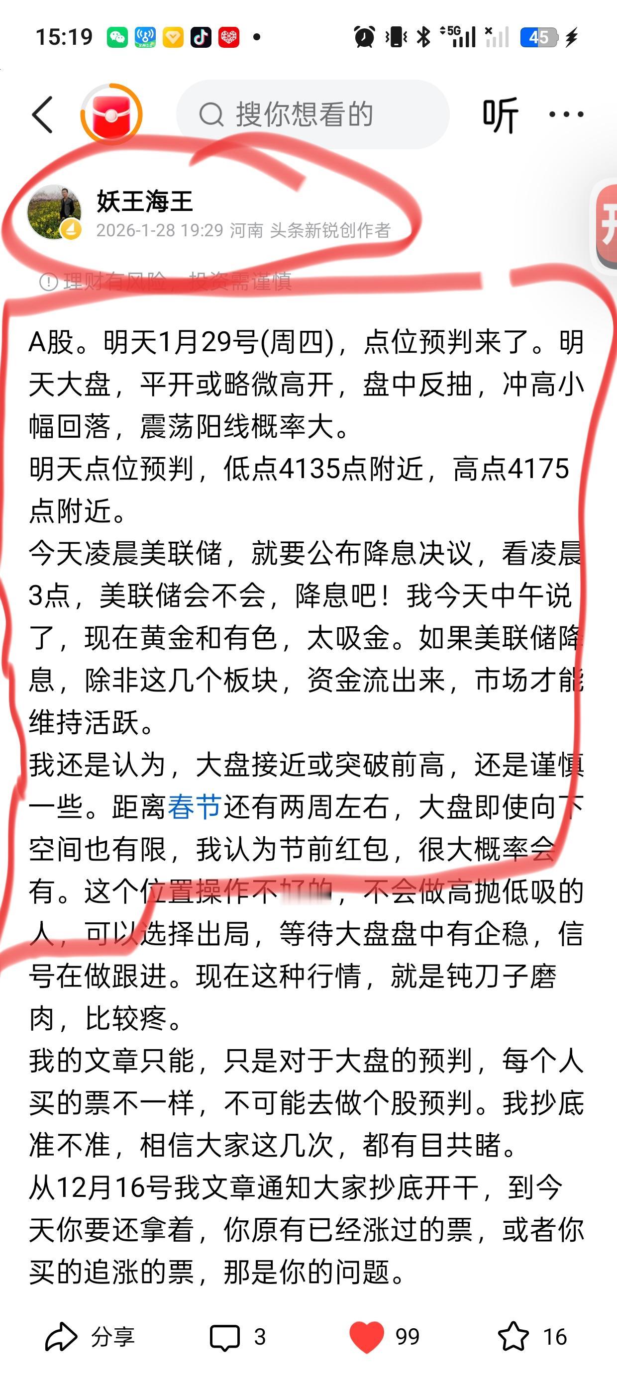 A股。今天1月29号(周四),下午收盘了。是不是再次验证了,我的判断。昨晚说了,今天平开或小幅高开,冲高回落,震荡阳线概率大。 点位预判文章,也给大家说了,今天低点4135点附近,高点4175点附近。今天盘中最低点4138点,最高点4170点,上下误差,没过10个点。你们见证了我的判断。 我昨晚还有中午文章,都说了,这个位置即使向下空间也有限,我说了这个位置,倒车接人,洗盘概率大,年前红包可期,这个位置连续几天,杀个股,大盘窄幅震荡横盘。不就是一边在杀高涨的情绪个股,一边护盘,不然指数跌下去。 明天业绩披露就要结束了,你认为大盘会怎么走呢!评论探讨探讨。