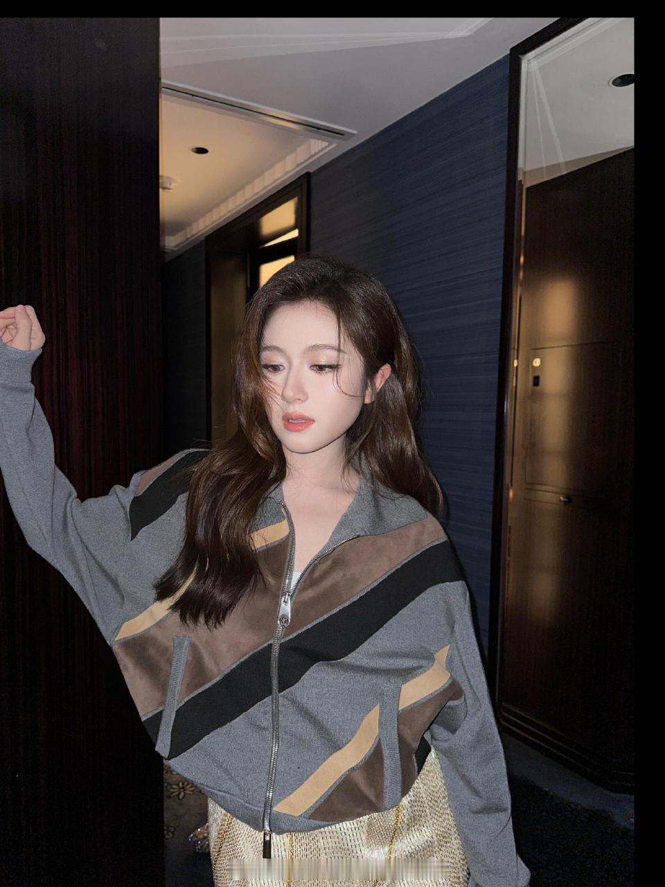李兰迪美到直接上演耳环消失术,拼接夹克搭配鎏金短裙,复古又时髦