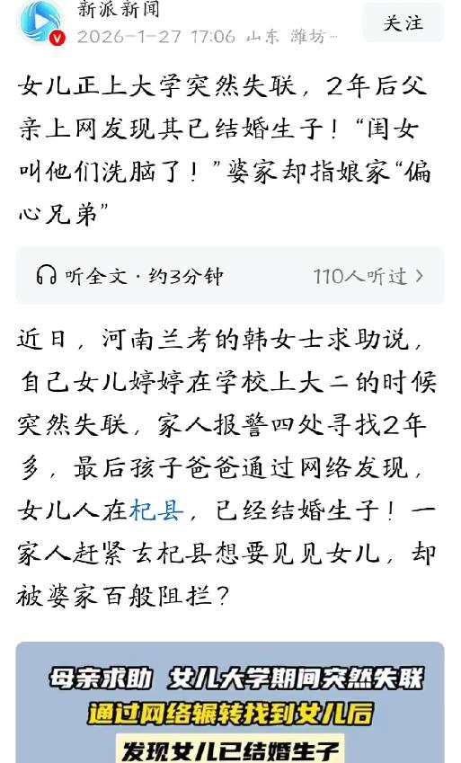 这种女儿不要也罢!河南兰考,大二女生突然失联,家人苦苦寻找,两年后竟在网上偶然发现,她已经结婚还生了孩子。父母赶紧赶到女孩婆家,想要把她接回来,谁知女孩却死活不愿意。女孩公公表示:孩子说母亲对她不好,偏心兄弟,她一辈子都不想回娘家。女孩母亲满肚子委屈:家里是穷,但我一碗水端平,我姑娘就是叫你们洗脑了! 说起这事,真是让人心里五味杂陈,既觉得心酸又感到无奈,想一下,如果你辛辛苦苦供出来的大学生女儿突然没了音讯,找了整整两年,头发都急白了,结果最后发现她不仅没事,还在隔壁县成了家、生了娃,甚至当你找上门时,她哪怕死都不愿意跟你回家,这得是多大的打击? 这事发生在河南,婷婷(化名)两年前才二十岁,正是花一样的年纪,还在读大二,在父母眼里,婷婷一直是个让人省心的孩子,家里虽然不富裕,但她争气,考上了大学,全家都指着她有出息。 可谁能想到,就是这么个乖孩子,突然有一天就像人间蒸发了一样,电话不接、微信不回,学校宿舍的床铺也空了,彻底断了跟家里的一切联系。 那时候,婷婷的妈妈韩女士感觉天都要塌了,她和丈夫发了疯似的找,报了警,跑遍了所有婷婷可能去的地方,大街小巷贴寻人启事,见人就问,找同学、找亲戚,能想的招都想了。 老天爷像是跟这家人开了个玩笑,就在老两口快绝望的时候,婷婷爸爸在刷短视频时,无意中刷到了一个让他心跳骤停的画面。 视频里那个抱着孩子的女人,怎么看怎么像自家闺女婷婷,旁边还站着个陌生男人,配文写着“喜得贵子”,再一看定位,就在隔壁杞县,离他们兰考老家也就几十公里。 老两口当时那个心情,真是又惊又喜,顺着视频里的线索火急火燎地找了过去,到了杞县的一个村子里,人是找到了,可眼前的景象让韩女士的心瞬间凉了半截。 曾经那个意气风发的大学生婷婷,现在穿着最普通的农村妇女衣裳,怀里抱着个半岁的婴儿,身边站着她的丈夫,也是她以前的同学,原来,这两年她根本没去上学,早早就辍学结了婚,甚至连孩子都生下来了。 韩女士当时眼泪就下来了,伸手就要去拉闺女,想着赶紧把孩子领回家,谁知道,婷婷反应大得很,猛地就把手甩开了,那个决绝劲,仿佛面对的不是亲妈,而是仇人。 她咬着牙,冷冰冰地甩出一句:“我不回去,死也不回兰考!”这话就像晴天霹雳,把韩女士劈得愣在原地。 这时候,婷婷的公公王先生站出来说了话,这才揭开了婷婷离家出走的真相,原来,两年前婷婷是自己挺着六个月的大肚子找上门的,根本不是被拐骗来的。 据婷婷自己说,她在那个家里过得太压抑了,她觉得父母严重重男轻女,什么好吃的、好用的都留给弟弟,她永远只能穿别人剩下的破旧衣服,而且只要稍微犯点错,妈妈就是一顿打骂。 王先生也挺无奈,说既然孩子自己不愿意回,他们也不能硬逼,而且孩子生下来后,他其实联系过韩女士,可当时韩女士一来就要强行带人走,嘴里还说着“绑也要绑回去”,这种强硬的态度,反而让婷婷更反感,彻底关上了沟通的大门。 听到这些指责,韩女士也是满肚子的委屈,哭着辩解说:“我就一儿一女,手心手背都是肉,怎么可能偏心?家里穷是事实,穿旧衣服那是没办法。我和孩子他爸省吃俭用供她上大学,这就是最大的爱啊,怎么就成虐待了?” 旁边的侄女也帮着姑姑说话,承认姑姑确实打过婷婷,但那是因为婷婷不好好学习,做父母的那是“恨铁不成钢”,心里急才动的手,哪有当妈的真恨自己孩子的? 后来韩女士生了重病,想让女儿回家看看,把病床照发过去,婷婷却认为那是骗她回家的手段,根本不信,王先生也说,因为之前韩女士上门闹得太凶,还动了手,婷婷现在对娘家人是一点信任都没有了。 哪怕后来有调解员去劝,婷婷也是要么一言不发,要么起身走人,后来干脆连电话都不接了,看着女儿紧闭的房门,韩女士最后只能无奈地叹气,松了口:“我不逼她了,只要她过得好,哪怕偶尔回来看看我就行。” 这事传到网上,大家也是议论纷纷,有人觉得婷婷太狠心,父母含辛茹苦供她上大学,就算小时候受了点委屈,也不该连亲妈病重都不管,但更多人觉得,未经他人苦,莫劝他人善。 一个正在读大学的姑娘,宁愿放弃学业躲到农村生孩子也不愿回家,那心里的伤得有多深?在青春期敏感的孩子心里,父母眼里的“严加管教”和“无奈之举”,可能就是一辈子挥之不去的阴影和偏心。 说到底,这事是个彻头彻尾的悲剧,韩女士两口子失去了女儿的心,落得个晚景凄凉,婷婷虽然逃离了原生家庭,但也背负着沉重的心理包袱,斩断了退路。 或许在父母看来,供书教学就是最大的恩情,但在孩子心里,平等的尊重和爱才是最渴望的。 如今婷婷自己也当了妈,希望她能慢慢解开这个心结,也希望天底下的父母都能明白,爱不是控制,也不是打着“为你好”的旗号去伤害,别让家变成了孩子拼命想逃离的牢笼。 对此你怎么看? 信源:百姓调解