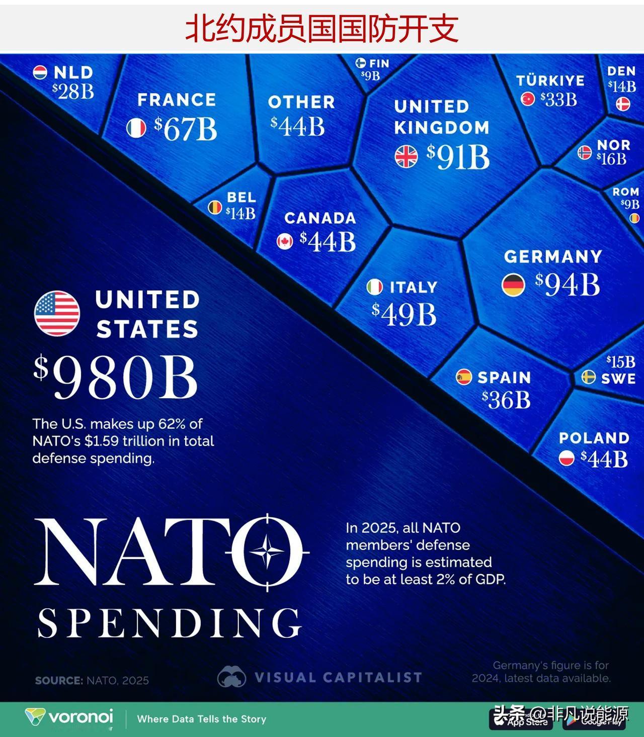 2025 年北约各成员国国防支出是多少? 在俄罗斯入侵乌克兰以及全球安全问题再度引发担忧的情况下,经过多年的资金投入不足之后,北约成员国已加快了军事投资的步伐。 该图表按照 2025 年各北约成员国的预计国防开支进行了排名,突显了该联盟内军事预算的巨大差异。尽管所有成员国目前都达到了北约规定的占国内生产总值 2%的基准,但具体的美元金额却显示出规模和能力上的显著差异。 此次可视化所使用的数据来源于北约最新的支出报告。德国的数据反映了 2024 年的支出情况,这是目前可获取的最新数据。 ——2025 年各北约成员国预计支出排名 美国依然是北约军事力量的支柱,其国防开支估计达 9800 亿美元。这约占北约总国防预算的 62%,远远超过了其他任何成员国的开支。 尽管欧洲盟友的军费开支大幅增加,但美国仍为该联盟提供了大部分的军事能力,包括先进的武器系统以及全球军事力量的部署能力。 ——欧洲最大的军费开支国 在欧洲成员国中,英国(905 亿美元)、德国(937 亿美元)和法国(665 亿美元)的经济规模位居前列。 德国国防开支的大幅增长标志着一个历史性的转变,因为该国正在摆脱数十年来的军事克制政策。 波兰的表现也十分突出,其国防开支达 443 亿美元,这反映了其作为前沿国家的地位以及东欧地区日益增强的安全忧虑。 ——规模较小的成员,共同承诺 北约较小成员国在绝对数量上所做出的贡献要少得多,但如今许多成员国已将大量国家资源投入到国防建设中。像爱沙尼亚、拉脱维亚和立陶宛这样的国家(每个国家的国防支出均低于 40 亿美元)在国防投入方面相对于国内生产总值而言的占比却相当高。 在欧洲之外,加拿大(439 亿美元)和土耳其(326 亿美元)在该联盟中发挥着至关重要的战略作用。