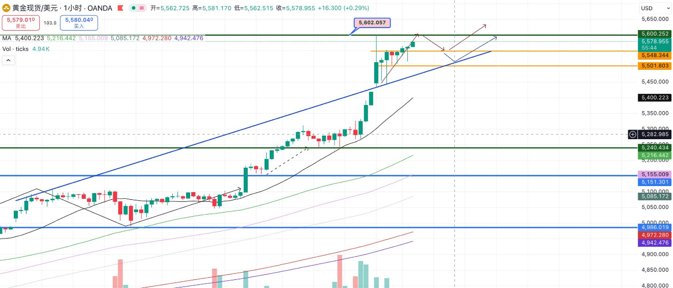 目前来看,黄金不存在所谓的“绝对顶部”,只有价格不断被抬高的过程。周四早盘,金价一度触及 5596 美元/盎司,多头情绪依旧占据主导。接下来市场的关键在于 5550 美元 这一价位的得失。如果欧洲交易时段能够稳稳站在 5550 上方运行,说明多头结构仍然完整,价格有望继续向上测试 5580 / 5600 / 5620 一线。但如果金价始终被压制在 5550 下方,无法有效收复,那么上涨动能可能暂时衰减,美盘阶段不排除出现进一步修正,目标将指向 5500 附近。当前阶段,更重要的不是猜顶,而是观察价格是否还能被市场持续接力。方向,交给价格自己来证明。黄金金价国安 人在做天在看