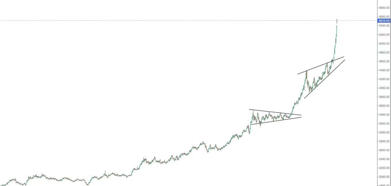 黄金价格呈抛物线式上涨,三个交易日内涨幅达10%。涨势不可挡。无论最终价格是7000美元还是8000美元,都无关紧要。深哥只想为那些持有黄金的人感到高兴黄金金价曝金晨肇事逃逸