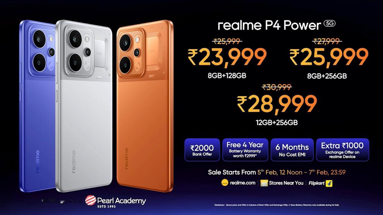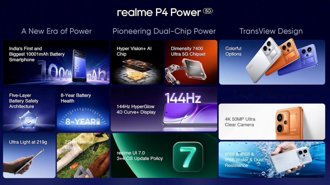 真我第一款电池破万的量产机——realme P4 Power 5G 在印度发布,8+128GB 首销 23999 印度卢比(约 1812 元)、8+256GB 首销 25999 印度卢比(约 1963 元)、12+256GB 首销 28999 印度卢比(约 2189 元)。国行或许会有人在期待?确实在规划了。 - 芯片:联发科天玑 7400 Ultra 处理器,Hyper Vision+ AI 独显芯片,LPDDR4X 内存,UFS 3.1 闪存; - 屏幕:6.8 英寸 2800×1280 OLED 2.5D 微曲屏,支持 144Hz 刷新率,240Hz 触控采样率,手动最大亮度 600nits(增大亮度模式 1000nits)、HBM 模式 1800nits、局部峰值亮度 6500nits,支持 HDR10+、10.7 亿色,康宁大猩猩玻璃 7i 面板; - 相机:前置 16MP,后置 50MP 主摄(索尼 LYTIA 600,1/1.95",OIS)+ 8MP 超广角双摄; - 续航:10001mAh 电池,80W 快充,支持 27W 反向充电,支持全场景旁路充电,全球首款通过德国莱茵 TÜV 五星级电池认证的 10000mAh+ 手机电池 - 其他:厚 9.05mm,重 219g,透明银、透明橙、透明蓝 3 款配色,Wi-Fi 5、蓝牙 5.4,支持 IP66 & IP68 & IP69 防尘防水,搭载 realme UI 7.0 系统。