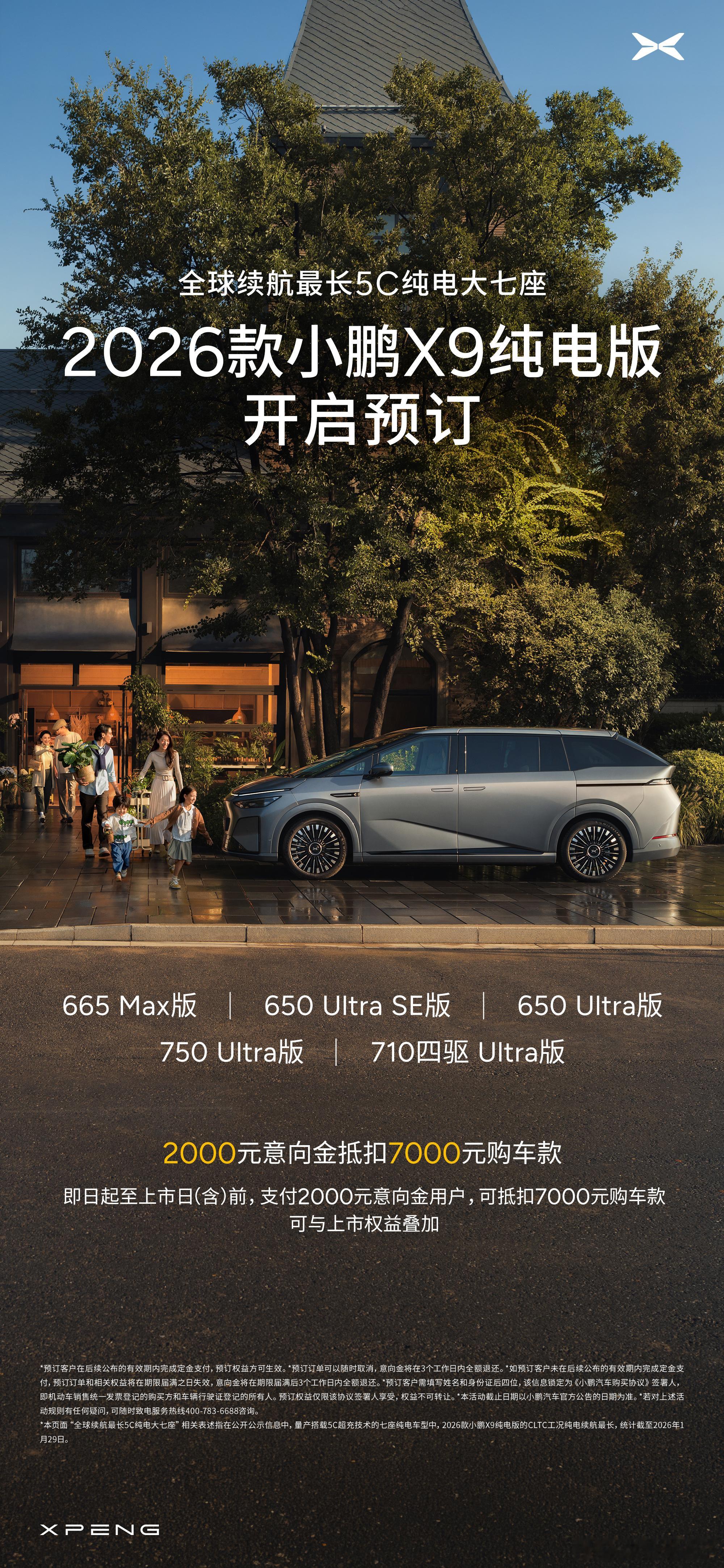 2026 款小鹏 X9 纯电版开启预订。定位不变,核心是把纯电版本的产品力拉到与 X9 超级增程同一水平。几项产品关键信息:- 全系 5C+800V 高压平台,- 最长 CLTC 续航里程 750km,- 目前 5C 纯电大七座中续航最长,- 后轮转向+全系升级三排电动三折叠,- 标配带安全气囊零重力、RNC 主动降噪;X9 方向很明确,不做纯电妥协版,而是纯电、增程两条路线,体验对齐。全球续航最长5C纯电大七座小鹏X9来了新款小鹏X9纯电版同增程版一样全能