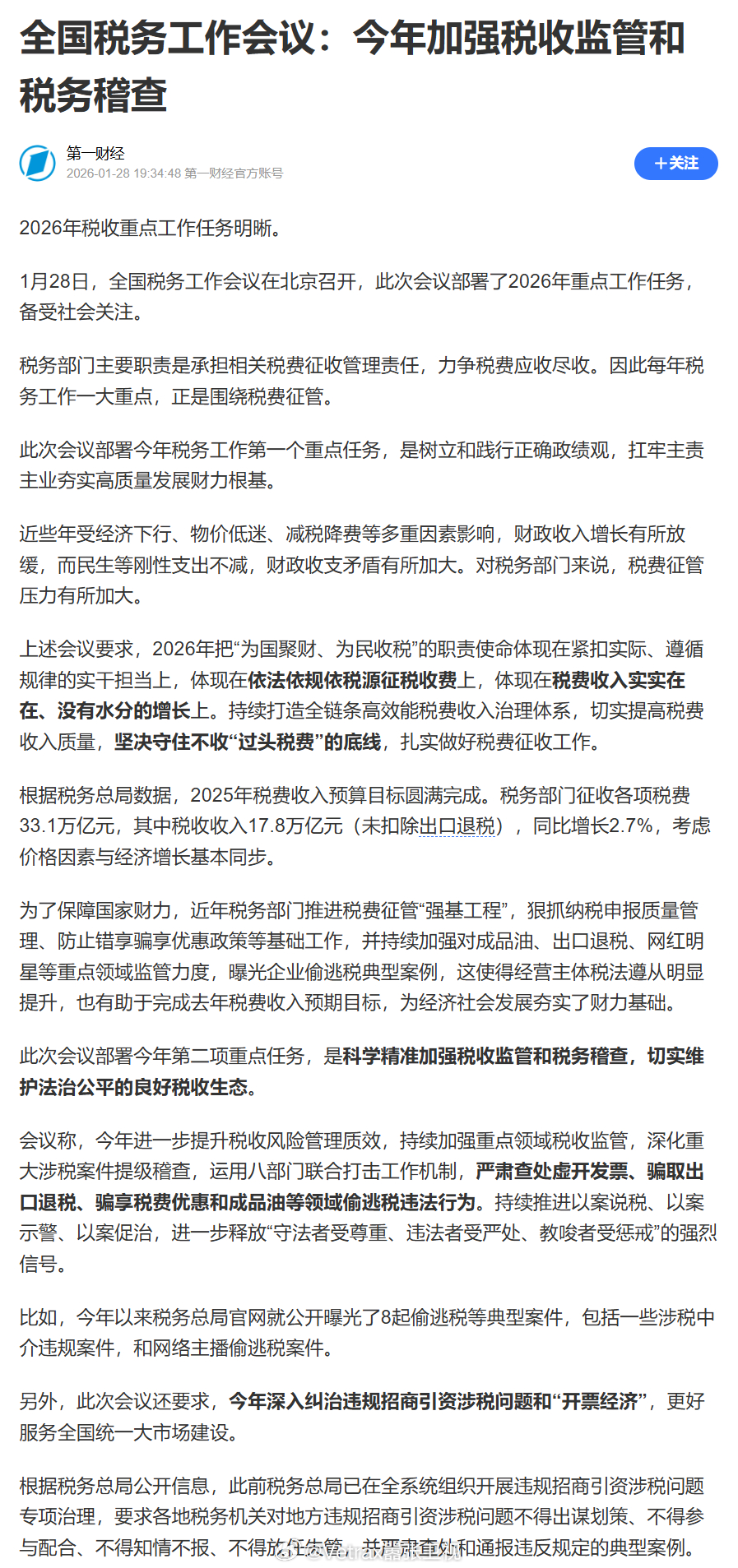 各位自媒体要留意这个信号:全国税务工作会议在北京召开,此次会议部署了2026年重点工作任务——加强税收监管和税务稽查。【并持续加强对成品油、出口退税、网红明星等重点领域监管力度,曝光企业偷逃税典型案例】【严肃查处虚开发票、骗取出口退税、骗享税费优惠和成品油等领域偷逃税违法行为】税务系统正在开展对过去 6-7 年(甚至更长时间的)税务倒查的行动,如果自己碰上了税务部门打来的电话说让你协助调查提供资料,千万不要心存侥幸……