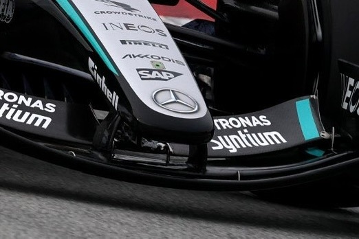 梅赛德斯前翼设计很特别,鼻锥与第一层襟翼连接,第一层襟翼是固定的,在主动前翼套件打开时不会偏转。其他车队比如法拉利,鼻锥与前翼主板连接,主动前翼套件打开时,两层襟翼都有偏转。f1f1巴塞罗那试航周