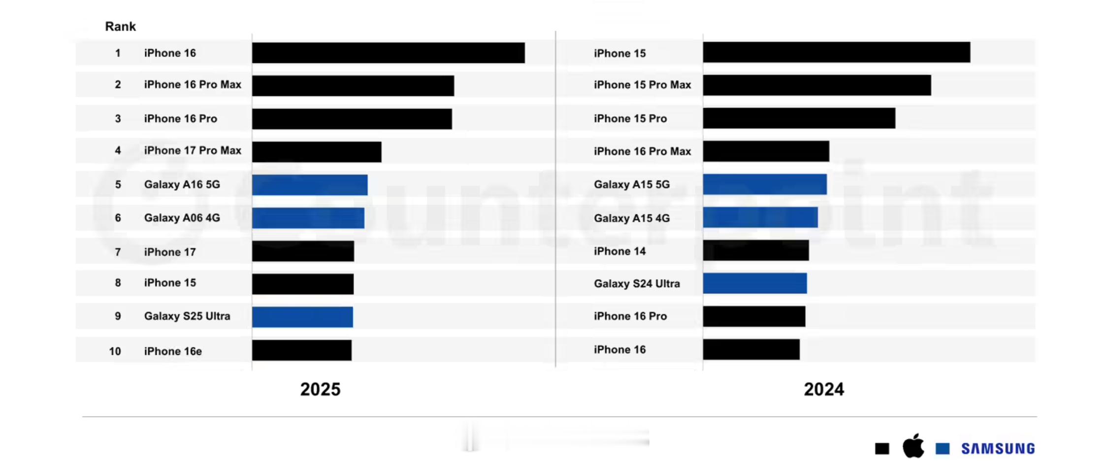 2025 年全球最畅销智能手机 TOP10 出炉,苹果 7 款,三星 3 款,前四排名和 2024 年一模一样,只是换成了迭代机型,iPhone 16 拿下榜首,不过 iPhone 16e 竟然也能上榜是我没想到的:1.iPhone 162.iPhone 16 Pro Max3.iPhone 16 Pro4.iPhone 17 Pro Max5.三星 Galaxy A16 5G6.三星 Galaxy A06 4G7.iPhone 178.iPhone 159.三星 Galaxy S25 Ultra10.iPhone 16e三星除了一款 Ultra,另外两款都是中端机,整体价位段和苹果比还是差了很多。2026 全球最畅销智能手机想都不用想肯定是 iPhone 17 了。iPhone16成去年最畅销智能手机