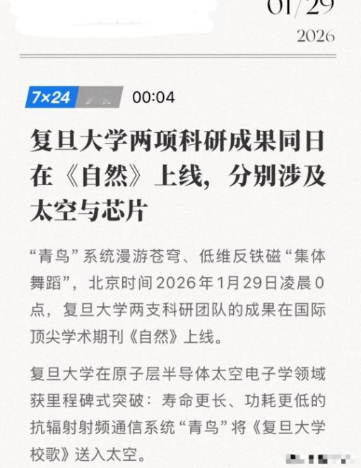芯片革命一夜引爆!1月29日凌晨0点,全球科学界被中国“偷袭”!   1月29日0点,复旦大学两支团队同时登上国际顶级期刊《自然》——不是一篇,是两篇!硬核科技刷屏全球。   最受关注的就是“青鸟”原子层半导体通信系统,这可是全球首个能抗辐射、还超低功耗的太空通信设备。简单说,以前咱们的卫星在太空里,最怕的就是宇宙射线。   2026年1月29日凌晨,复旦大学两支团队同时在国际顶级期刊《自然》发表论文。这一成果中,最引人注目的是“青鸟”原子层半导体通信系统。这是全球首个能抗辐射、还超低功耗的太空通信设备。这一突破让卫星通信技术进入了一个新纪元。   太空环境对电子设备来说十分恶劣。卫星在太空中运行,时刻受到宇宙射线的威胁。宇宙射线包含高能粒子和辐射,会对卫星上的半导体器件造成损伤,导致通信系统性能下降甚至失效。   传统的抗辐射方案,要么增加屏蔽层,要么采用冗余加固电路。这些方法虽然能提升可靠性,但会让设备体积增大、重量上升、功耗攀升,与未来航天系统“轻量化、智能化、低成本”的发展趋势背道而驰。   “青鸟”系统的研发团队来自复旦大学集成芯片与系统全国重点实验室。他们另辟蹊径,从材料本质特性出发,提出了颠覆性解决方案。   团队发现,当半导体材料厚度缩减至单原子层级时,高能粒子会像穿过透明玻璃般直接穿透,几乎不会造成累积损伤。基于这一原理,团队采用二硫化钼这种二维材料,设计出全球首个原子层半导体抗辐射射频通信系统——“青鸟”系统。   “青鸟”系统的核心功能层仅为单原子或少数原子厚度,厚度仅0.68纳米。这一厚度相当于一根头发丝直径的十万分之一。相比之下,传统硅基半导体材料的厚度往往在几百微米,一些薄层硅至少也有几十纳米。这种超薄的物理特性,让“青鸟”系统具备了天然的抗辐射优势。   为了验证“青鸟”系统的性能,团队进行了大量实验。他们对原子层半导体材料及器件进行了地面模拟辐照实验,采用的辐射剂量达到10兆拉德,这也是国内目前能达到的最高剂量水平之一。实验结果显示,器件性能依然保持稳定。   2024年9月24日,搭载“青鸟”系统的“复旦一号”卫星在山东成功发射,进入距地球517公里的低地球轨道。   为了验证系统性能,团队将复旦大学校歌原始手稿存入存储器,完成了以校歌为信号的太空通信传输测试。经过卫星天线发射和地面站解码,信号复原准确率达到100%。经过9个月在轨运行,系统数据传输误码率始终低于10??,充分证明了其优异的抗辐射性能和稳定性。   实验数据显示,即使在辐射强度更高的地球同步轨道,“青鸟”系统的理论在轨寿命可达271年,是传统硅基系统的100倍,而功耗却降低至五分之一以下。这种超长寿命和超低功耗的特性,使其成为深空探测、高轨卫星和星际通信等任务的理想选择。   “青鸟”系统的研发成功,背后是团队长达四五年的技术攻关。面对原子层半导体领域缺乏成熟设计工具的困境,研究人员不仅需要解决材料生长和晶体管制造等工艺难题,还自主开发了专用半导体设计工具。从基础材料研究到太空验证,该团队成为国内首个实现全栈技术自主创新的科研力量。   “青鸟”系统的工艺设计与现有产能完全兼容,可以直接投产,因此量产并非难事,且后续成本还能进一步降低。除了太空领域,在地面的高辐射环境中,原子层半导体技术也大有用武之地。例如,核工业是高辐射场景,人们希望用机器人来承担相关工作,原子层半导体就能够助其胜任。   “青鸟”系统的成功,开辟了“原子层半导体太空电子学”的创新领域,标志着人类向构建高可靠、轻量化太空电子系统迈出关键一步。这一突破不仅填补了二维电子器件空间在轨验证的空白,更为未来太空探索提供了新的技术路径。   国际权威期刊《自然》评价称,这项研究填补了二维电子器件空间在轨验证的空白,为构建高可靠、轻量化的太空电子系统开辟了新路径。二维材料独特的抗辐射特性,使其有望从实验室走向航天工程应用,加速推动新一代太空电子技术的发展。   随着“青鸟”系统的成功,复旦大学的科研团队并没有停下探索的脚步。他们正在探索将该技术应用于核聚变探测领域,原子层半导体的抗辐射能力可能使其成为监测核反应堆核心区的理想“电子眼”。   可以预见,“青鸟”系统的应用将推动我国在新一代空间信息基础设施中赢得先机,为我国航天强国建设与商业航天发展注入新的动力。未来,我们有理由期待更多类似的科技创新成果,为人类探索宇宙的征程提供更多的支持和保障。