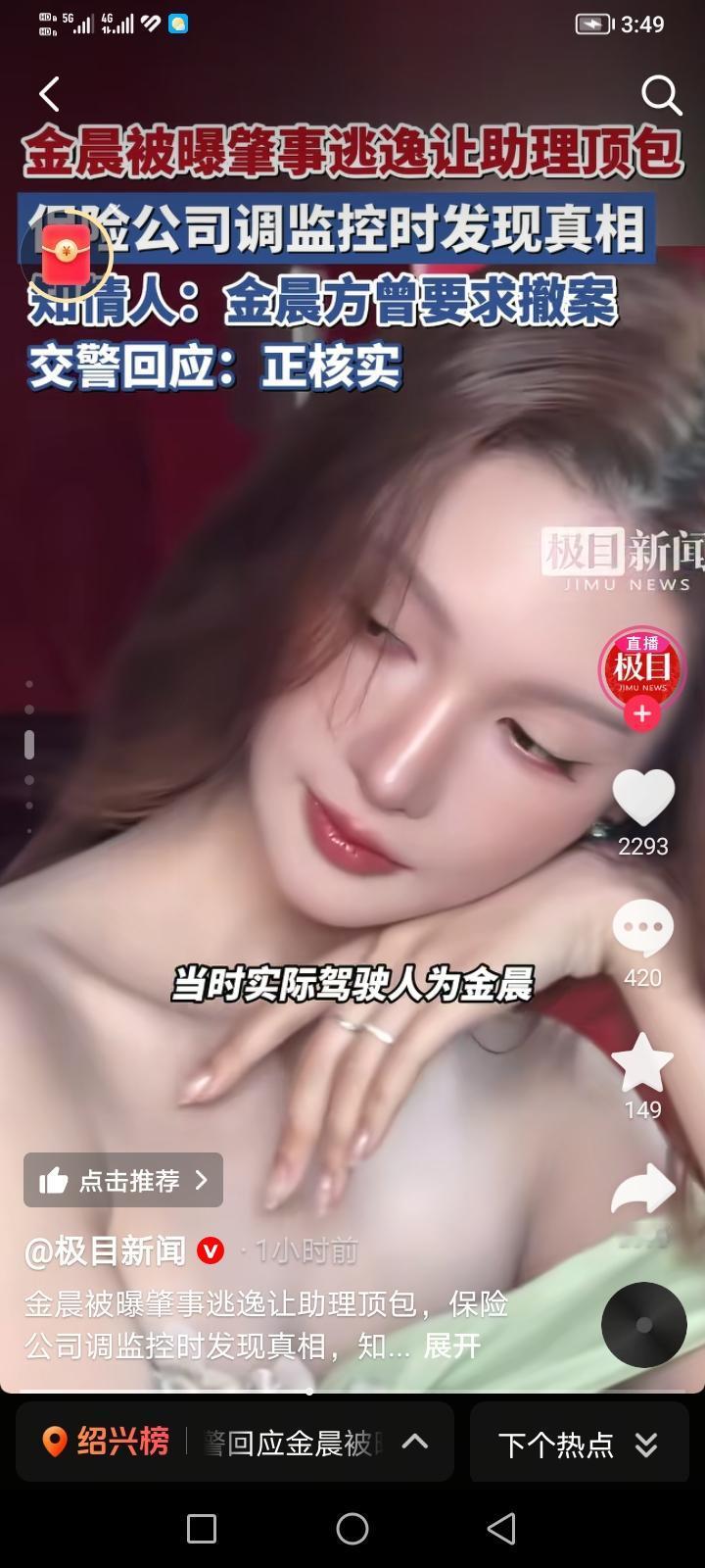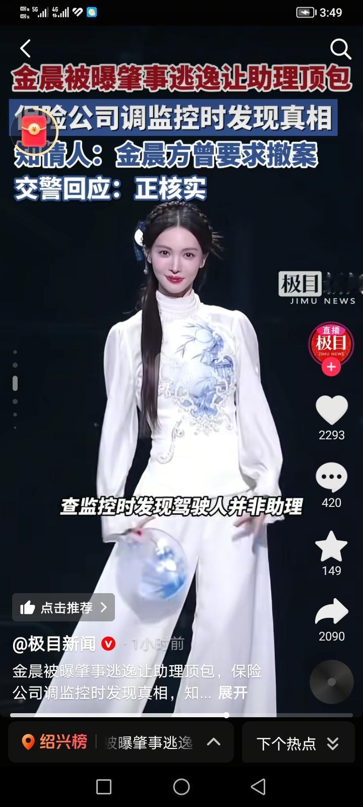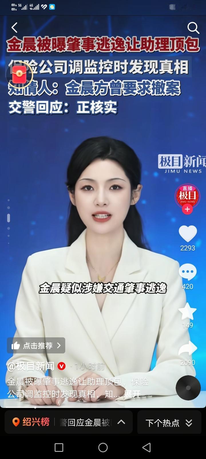 不得不说现在的保险公司是有几把刷子啊?破案能力都会赶上警察叔叔了。2026年1月29日,演员金晨被曝于2025年3月16日在浙江绍兴柯桥区湖塘街道岭下村发生交通事故,涉嫌驾车逃逸、助理顶包、骗保,目前金晨方未回应,绍兴柯桥警方已成立调查组核查 事发经过:2025年3月16日15时07分,金晨驾本人车辆(沪FEJ号牌)出事,经纪人坐副驾,助理徐长青在后座;金晨与经纪人离开,留徐长青处理并向交警“顶包” 。 - 认定与反转:交警认定书原认定徐长青全责;保险公司理赔调监控发现实际驾驶人是金晨,随即报案;金晨方要求撤案,保险公司后撤销 。 - 官方回应:绍兴交警柯南中队确认事故属实,柯桥区公安局已成立调查组,正在核查 。 虽然最后保险公司撤案了,但还是要给保险公司的工作人员点个赞啊,这负责任的态度,各行各业要有这工作态度,很多事情都会非常好解决。(图片信息来源:极目新闻)金晨 金晨身材好绝 明星金晨写真 撞车保险 保险 保险公司哪个靠谱