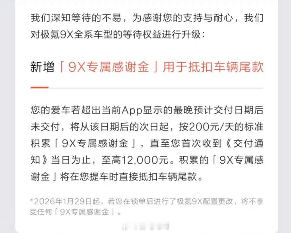 极氪9X 推出了等待金,如果提车时间超过了极氪APP显示的预计交付最晚日期,极氪将按200/天发放给用户,最高12000元。之所以推出这个9X专属等待金,还是由于极氪9X Hyper版/曜黑版前期积累的锁单量远超预期,同时个别专用核心零部件短期供应量波动。部分订单的交付会受到影响,如果是现在已经锁单了,预计交付的时间大家可以看一下最后一个图表喔。极氪