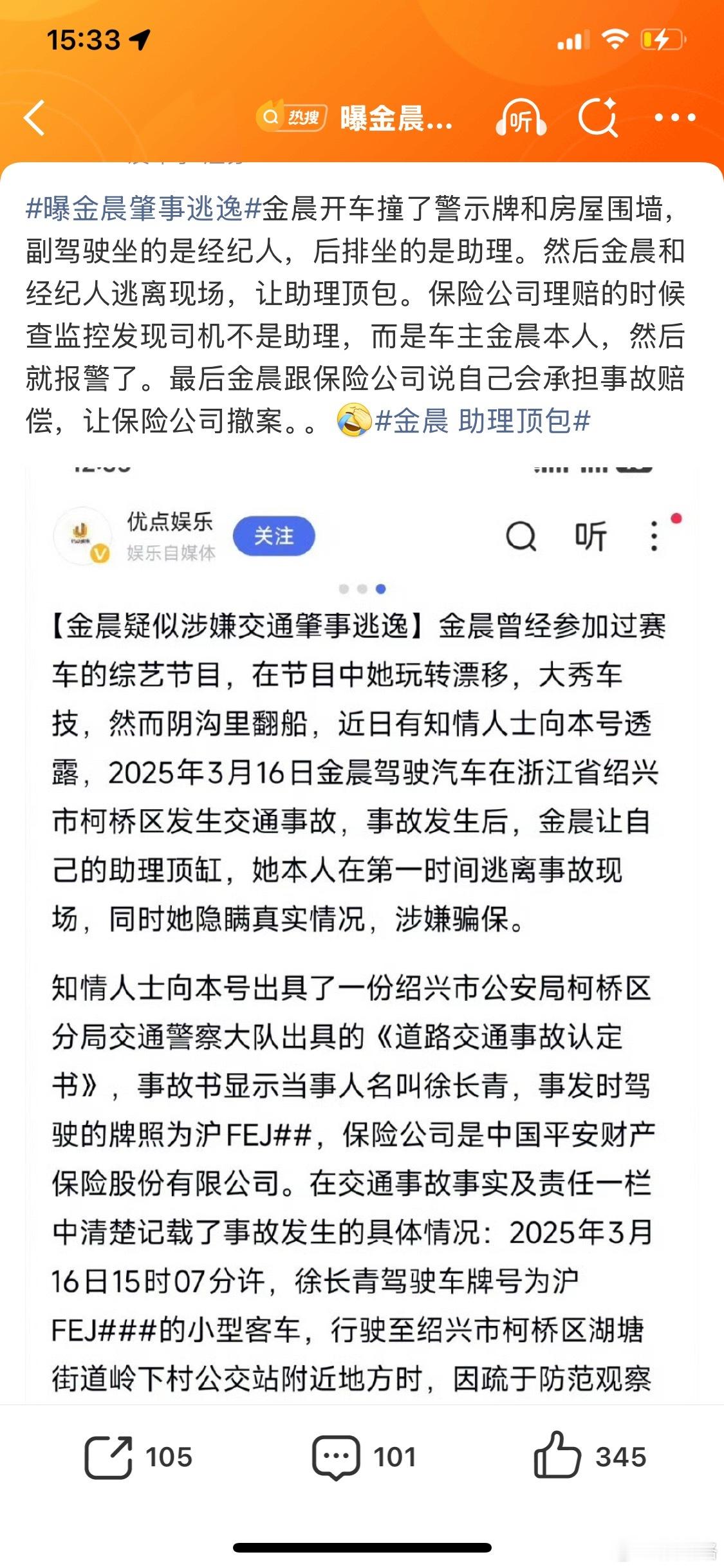 🤦♀️金晨这糊涂操作,真的糊涂啊唉,替她着急谁能想到去年还在春晚上跳舞的人,今年就爆出这么大的事啊。简单说就是:开车撞了墙,自己跑了让助理顶包,结果保险公司查监控发现是金晨自己开车直接报警。最后她只能自己掏钱求保险公司撤案。本来认错就行的事,非要搞成骗保,这性质直接变了啊!📺 不知她的待播作品后续如何:1️⃣ 电视剧《不为人知的故事》(搭档黄轩)2️⃣电影《骗骗喜欢你2》(与孙阳二搭)3️⃣ 电影《野火》(原定2026年3月底开机)4️⃣ 网传新剧《明川有知夏》(尚未官宣)一手好牌打得稀碎,艺人真的要珍惜羽毛啊🙏估计以后艺人都不会选择自己开车了保险公司调监控才发现是金晨开车保险公司调监控才发现是金晨开车