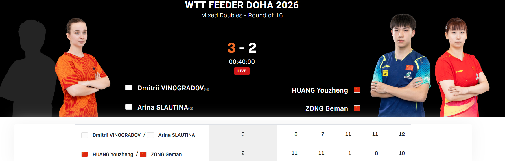 #黄友政纵歌曼2比3中立组合#2026WTT支线赛多哈站混双,黄友政/纵歌曼2-3遭到中立运动员组合维诺格拉多夫/斯劳蒂娜逆转,止步首轮。比分:11-8、11-7、1-11、8-11、10-12。#看WTT上咪咕#