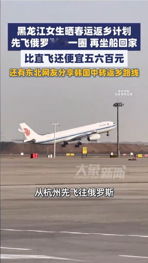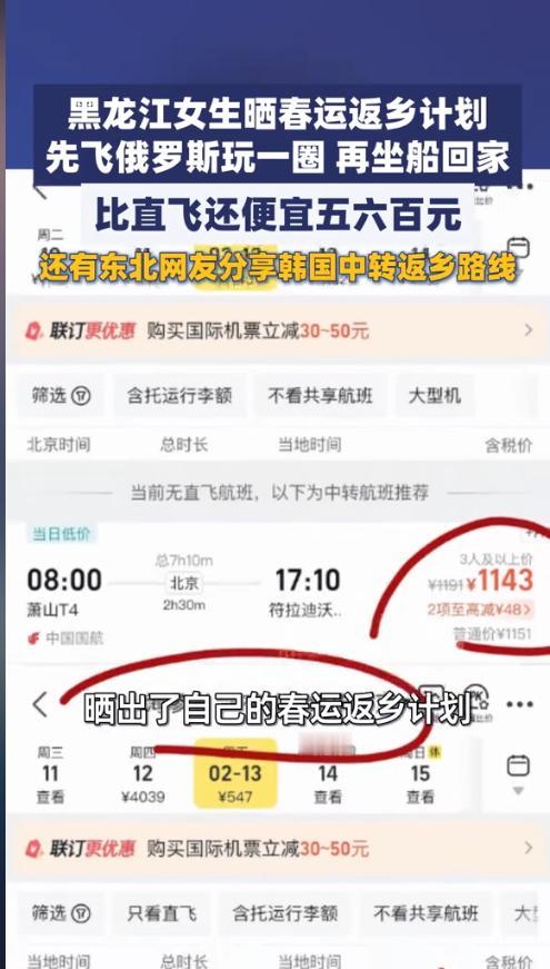 “人怎么能这么聪明!”近日,浙江杭州,一女子买过年回家的机票时,发现要两三千,感觉太贵了,反而飞俄罗斯的却很便宜,于是他竟想出迂回回家的策略,先飞往俄罗斯,再坐船回家,全程算下来,比直飞还便宜五六百元,网友:太有脑子了! 春运返乡是外出打工人年底的头等大事,抢票难、票价高一直是困扰大家的难题,不少人都在绞尽脑汁找省钱又便捷的返乡方式。 据媒体1月28日报道,女子为了春运回家,对比了多种交通方案,但一直没确定好到底是坐飞机还是火车,毕竟年底机票实在太贵,火车虽然便宜时间却很长。 正考虑着,突然看到飞俄罗斯的机票竟然比直接飞老家便宜很多,这顿时让她喜出望外,而后赶紧查了一下俄罗斯回家的车费,发现现在有中俄免签协议,可以从俄罗斯坐船回家,一趟算下来便宜不少,还能在俄罗斯玩一会。 女子买票后,将自己的买票方式分享到了网上,没想到竟引起一东北网友的共鸣。这位网友也晒出了自己回家的行程——先飞往韩国,再从沈阳回家,全程比直飞省了将近1000元。 网友看后表示,万万想不到,东北人回老家竟采用迂回方式,太有意思了,为了回家也是煞费苦心绞尽脑汁了。 信息来源:《黑龙江女生晒春运返乡计划,先飞俄罗斯玩一圈再坐船回家,比直飞还便宜五六百元》大象新闻
