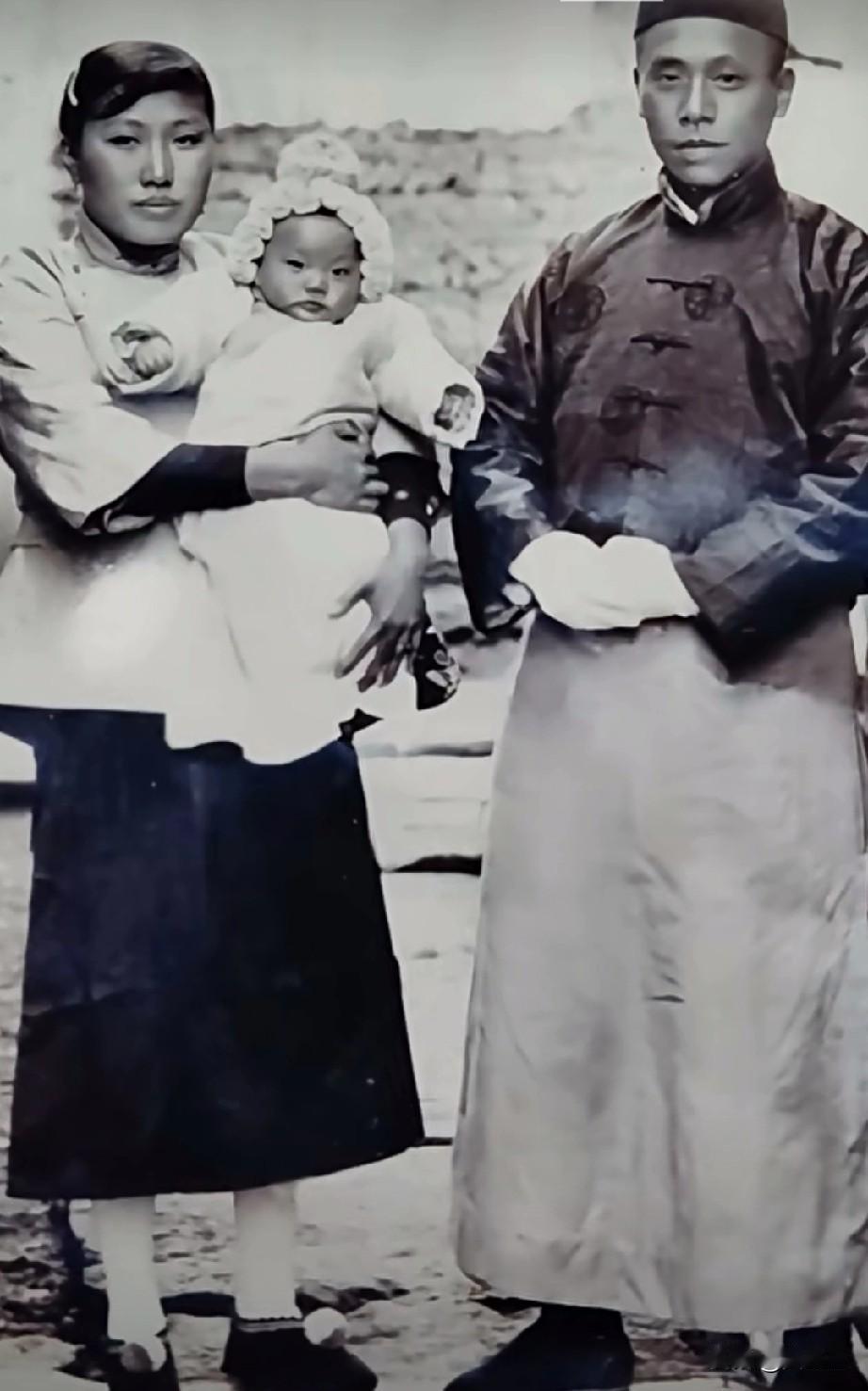 1924年初,浙江上虞五夫村一张旧照。 张国华先生与妻子,抱着儿子张友仁,张友仁先生,祖籍台州黄岩鼓屿,后来是北京大学经济系教授,著名的经济学家。