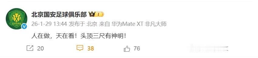 北京国安这是要干什么?国安官方发布最新微博太炸眼睛,直接写到:人在做天在看,头顶三尺有神明!疑似表达某种强烈不满! 1月29日,中国足协、公安部还有体育总局刚联合发布新一轮处罚决定,里面就有北京国安,结果北京国安就发了这个博文,疑似对处罚表达强烈不满!北京国安已经删除了这个微博,但是各大官媒还是不断报道。大家对此怎么看?