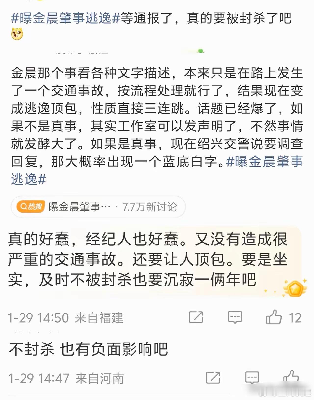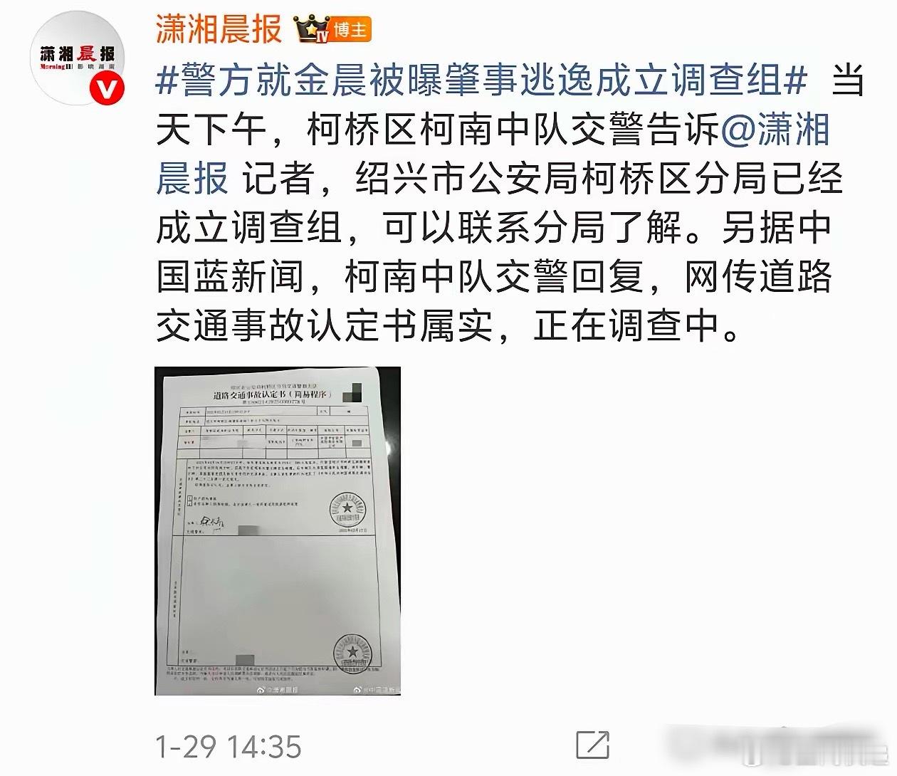 看车牌号和右下角的时间和狗仔爆料似乎一致,但图上的人应该不是金晨,身高看着就不是。看图片也不是大的交通事故,金晨理论上应该不至于找人顶包,估计是留助理在现场处理下?金晨目前手握十几个品牌合作的代言,待播的电视剧有两三部,她常驻的综艺节目《现在就出发》也口碑不俗,不至于为这种小事故逃逸吧?目前金晨没有回应,蹲一个后续!曝金晨交通事故监控截图曝金晨肇事逃逸交警回应网传道路交通事故认定书属实交警回应网传道路交通事故认定书属实