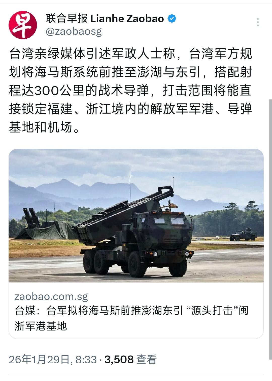 “台独”分子又在搞事情!1月29日,新加坡联合早报发文:“台湾亲绿媒体引述军政人士称,台湾军方规划将海马斯系统前推至澎湖与东引,搭配射程达300公里的战术导弹,打击范围将能直接锁定福建、浙江境内的解放军军港、导弹基地和机场。” 说实话,台军这算盘打得挺响,还想了 “保命招”。他们打算让 “海马斯” 平时躲在坑道里,打起来再冲出来发射,打完就跑,觉得这样咱们的卫星和雷达就抓不到。为了这套装备,台湾可是下了血本,前后买 111 套花了 50 多亿美元,平均一套 4500 万,比不少战斗机都贵。 可他们忘了,这世上根本不透风的墙,东引岛就 4.35 平方公里,住几百人却驻了 3000 兵,跟个军事堡垒似的。这么个弹丸小岛,就算坑道挖得再深,真到关键时刻,就像把鸡蛋藏在透明盒子里,根本藏不住。咱们的卫星天天盯着,一举一动都看得清清楚楚。 要知道,这不是台湾第一次搞 “军事秀” 了。以前买过不少美国武器,号称能 “以武拒统”,可这根本不管用,就说 “海马斯” 配的火箭弹,111 套才够打 3 个波次,根本撑不了多久。他们真正指望的是那 504 枚战术导弹,可咱们早有准备,PHL-191 火箭炮能打 500 多公里,比他们的射程还远一截,完全能把威胁掐在源头。 更可笑的是,台湾以为抱上美国大腿就有底气。可美国卖武器从来都是 “卖瓜不卖籽”,给的导弹数量刚好够挑事,却不够真打仗。就像之前日本花 127 亿美元买美国公司,最后还被拜登一脚踢开,美国连盟友都坑,根本不可能真心帮台湾。 而这事儿对咱们普通人也有影响,真要是导弹架到家门口,福建、浙江沿海的安宁肯定受影响。但大家不用慌,咱们的国防力量早今非昔比,就像家里装了最先进的防盗门,别人再怎么撬锁,也进不来。 而未来台军大概率会搞些部署演练,想制造紧张气氛。但他们心里清楚,真把 “海马斯” 推到外岛,等于给咱们递了 “靶子”,反而加速统一的脚步。美国说不定还会趁机再卖一批武器,赚笔 “战争财”。 说到底,台湾是中国的一部分,是国际公认的事实,而台湾把武器架到家门口的蠢事,只会让自己陷入危险,最后吃苦头的还是台湾老百姓。 以上是小编个人看法,如果您也认同,麻烦点赞支持!有更好的见解也欢迎在评论区留言,方便大家一同探讨。