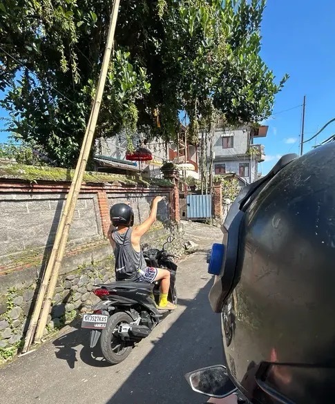 这一幕太搞笑了小伙子带女友乘坐一辆摩的因为生怕女友的胸口蹭到摩的师傅后背