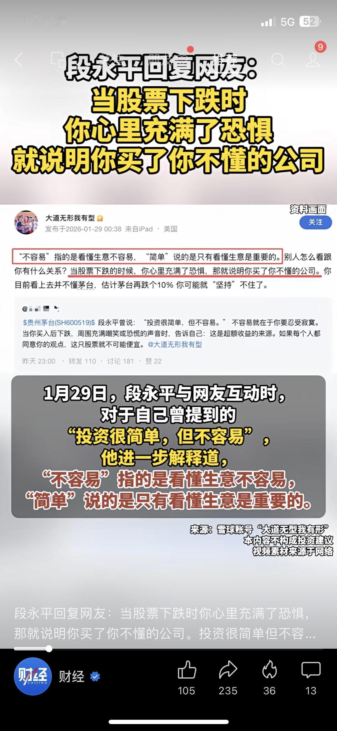 段永平扎心提问:股票跌了你慌,就是买错了! 段永平今天回复网友,一句话点醒所有人:股票跌了心里满是恐惧,本质就是买了自己看不懂的公司!我开水果店的张叔买茅台跌10%都淡定,因为他懂茅台的底气。投资的底气,从来不是赌涨跌,是看懂生意。 你买股票踩坑,是不是因为跟风买了看不懂的票? 段永平 投资感悟 财经热点