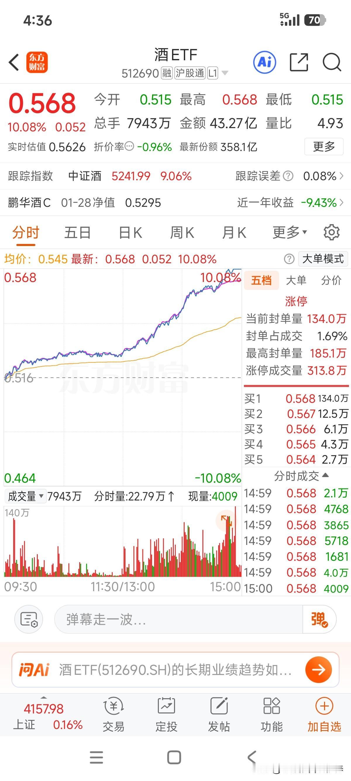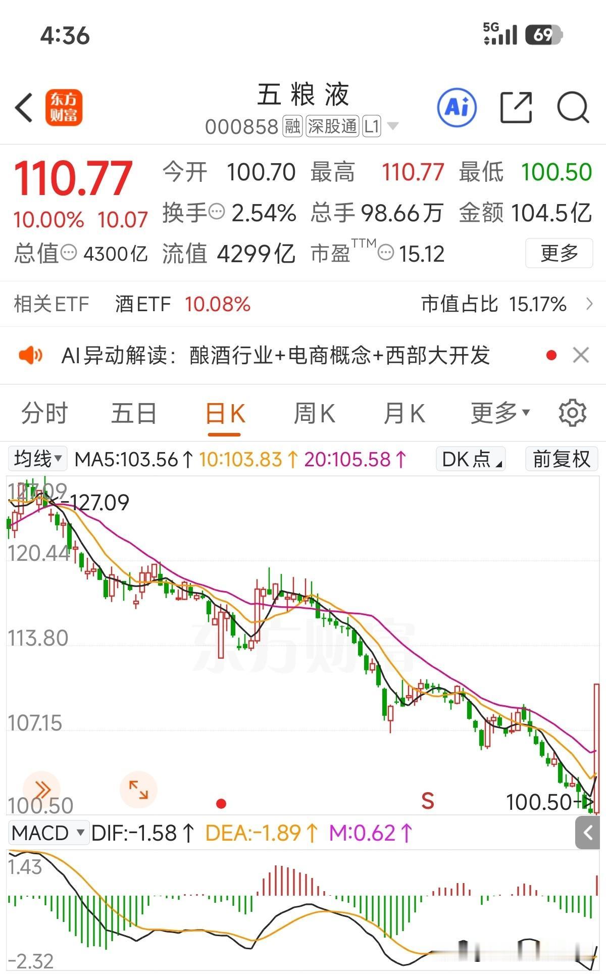 操盘的是高手,多少人等着五粮液破百,结果今天最低点离100差5毛直接拉升至封板!连酒ETF居然也给板上了! 底部不是靠猜出来的,现在是反弹还是反转也有待观察,但是很多准备破百下手的,都到了101元位置还不敢下手?在乎那1元的差价? 投资只要控制好仓位,理性分析估值,辅助看下技术走势!有时候适当主动入套并不是坏事!