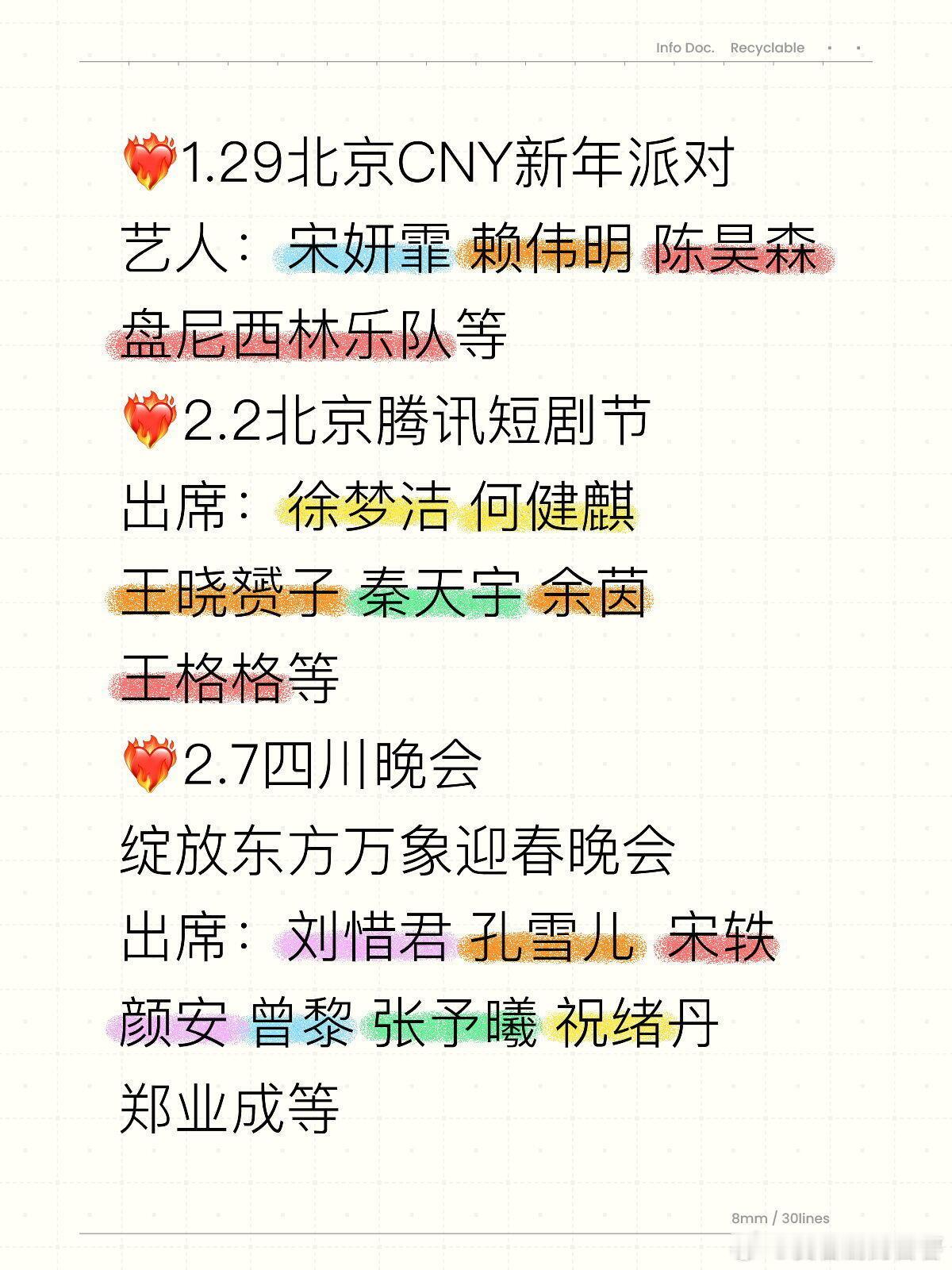 ❤️🔥1.29北京CNY新年派对艺人:宋妍霏 赖伟明 陈昊森 盘尼西林乐队等❤️🔥2.2北京腾讯短剧节出席:徐梦洁 何健麒 王晓赟子 秦天宇 余茵 王格格等❤️🔥2.7四川晚会绽放东方万象迎春晚会出席:刘惜君 孔雪儿 宋轶 颜安 曾黎 张予曦 祝绪丹 郑业成等北京CNY新年派对|北京腾讯短剧节|绽放东方万象迎春晚会|