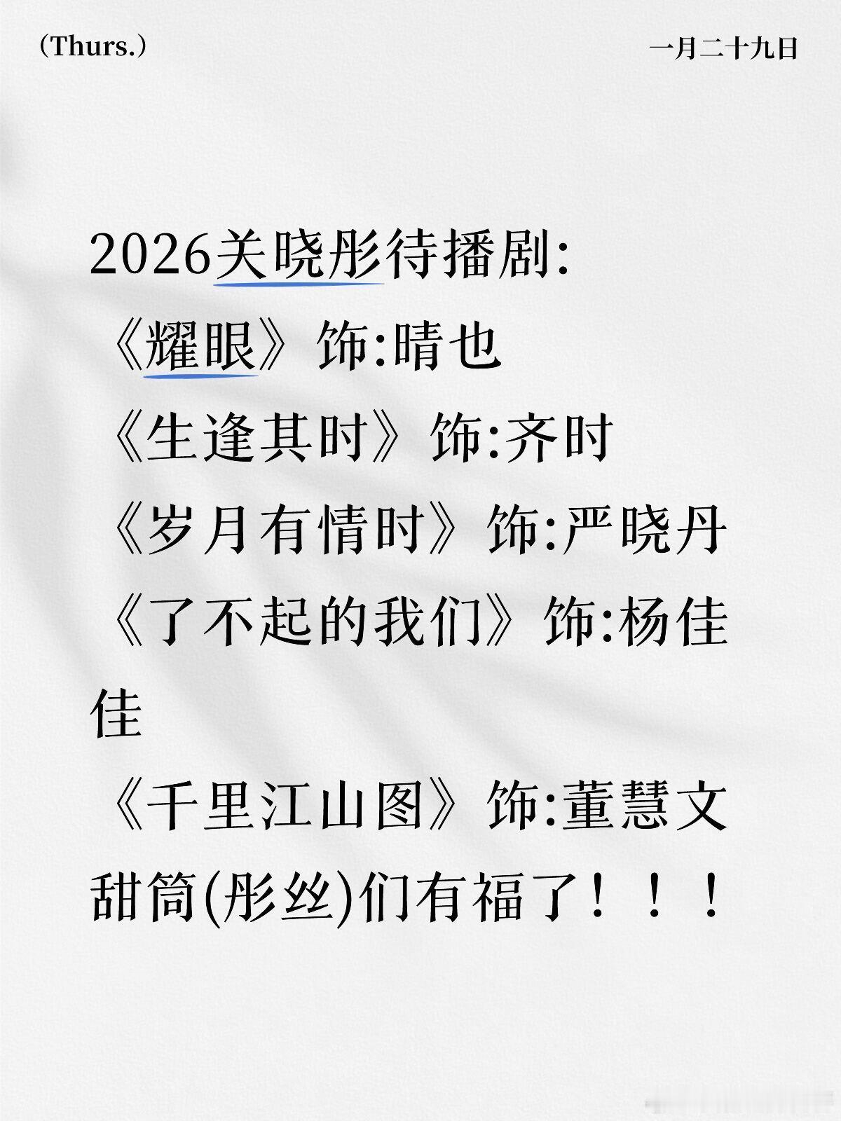 2026关晓彤待播剧:《耀眼》饰:晴也《生逢其时》饰:齐时《岁月有情时》饰:严晓丹《了不起的我们》饰:杨佳佳《千里江山图》饰:董慧文甜筒(彤丝)们有福了!!!关晓彤|
