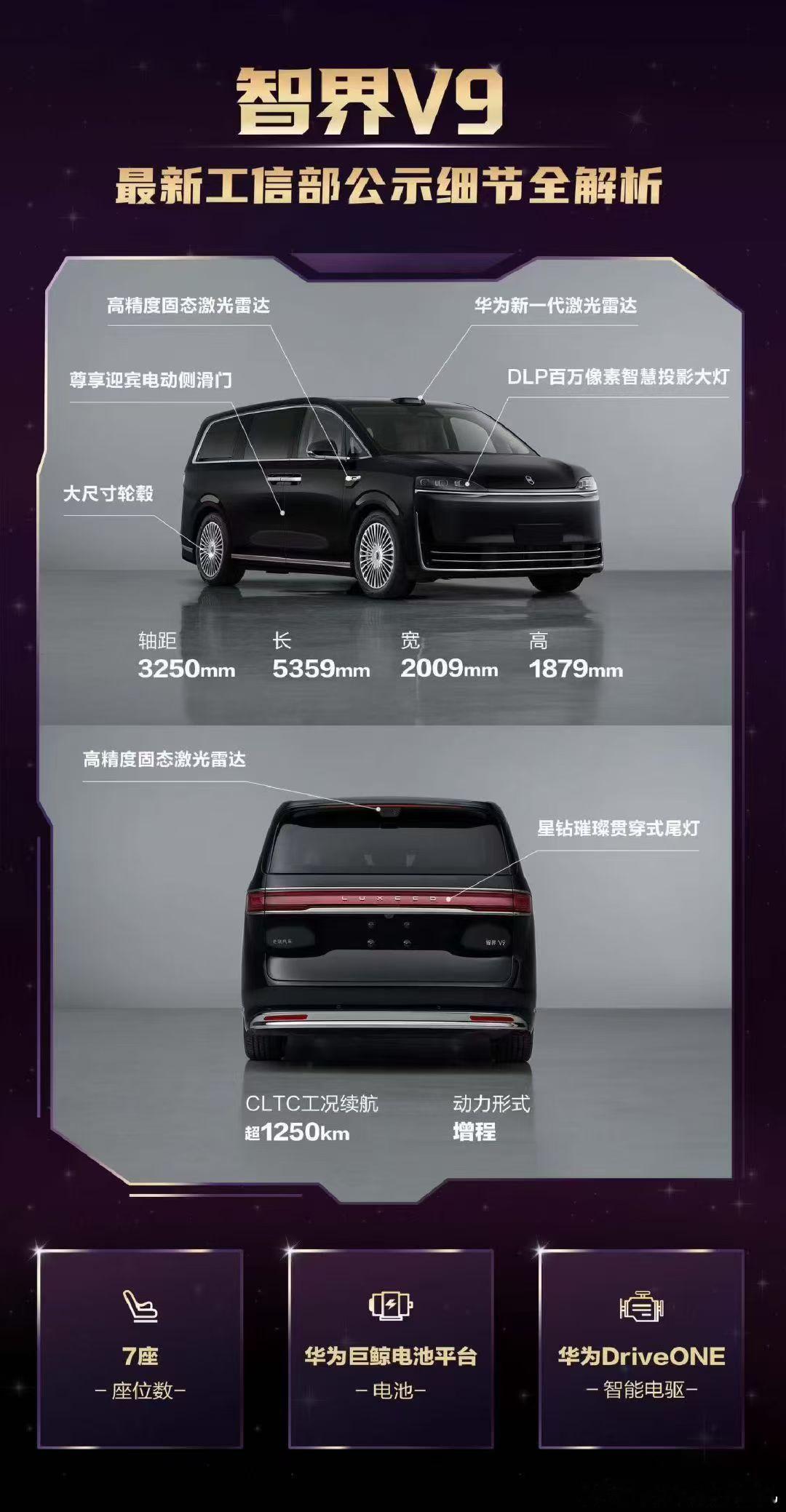 智界V9在工信部上公示了 可以看到一些细节解析一、核心信息速览• 定位:中大型MPV,2+2+3七座,鸿蒙智行“9系”旗舰• 尺寸:5359×2009×1879mm,轴距3250mm,整备质量2750-2940kg• 动力:华为雪鸮1.5T增程(115kW,热效率43.23%)+双电机,CLTC综合续航最高1250km• 电池:37.017kWh磷酸铁锂(WLTC纯电158km);53.352kWh三元锂(WLTC 210/223km)• 智驾:华为乾崑智驾ADS 4.0,多颗激光雷达,高阶辅助驾驶• 底盘:途灵平台,双腔空悬+后轮转向,操控与舒适兼顾• 价格:预计40-50万元看来年后就要开始一系列的发布会了