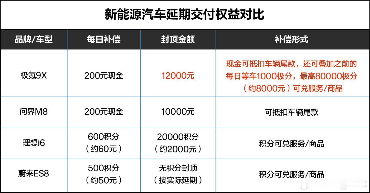 最近行业供应链不太稳定,有的缺内存,有的是缺电池。极氪9X这次顶配订单彻底卖爆了,同样遇上交付周期延后,官方主动拿出了更有诚意的权益。每天200块现金,最高封顶1万2,现金直接抵尾款,还能叠加之前攒的等车极分,每天1000分,最高可以抵8000元的服务或者商品,相当于最多可以有2万元的权益。现在的极氪,确实不一样了。